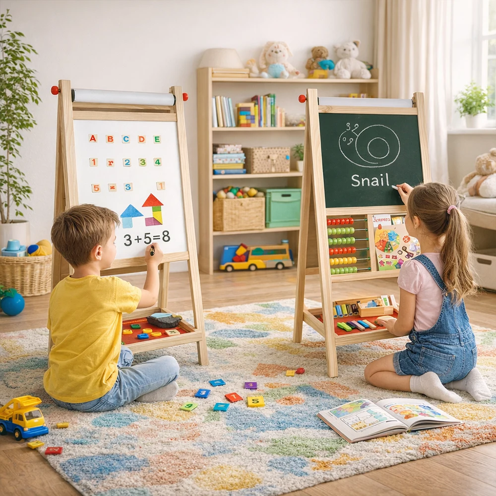 ✔️ Copii mici (1-3 ani): jucării Montessori, cuburi colorate, jucării din lemn și triciclete;