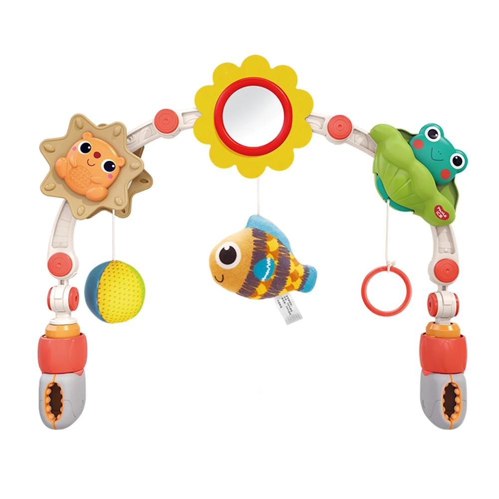 Jucăriile suspendate includ elemente interactive precum arici rotativ, broscuță tip peek-a-boo, minge, inele și o oglindă în formă de floare, care atrag atenția bebelușului și încurajează explorarea prin atingere, tragere și mișcare.