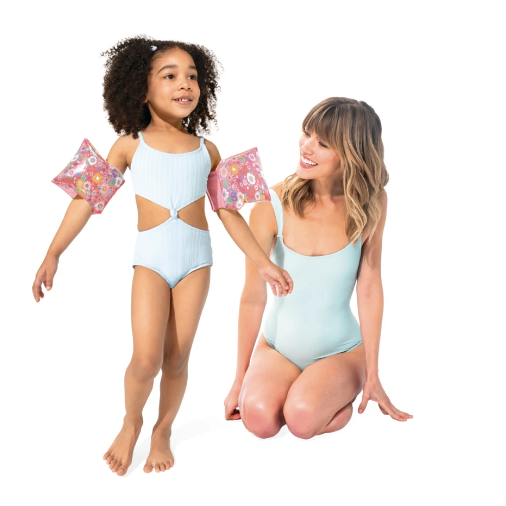 Aripioare de înot gonflabile cu design floral, potrivite pentru copiii cu vârsta între 3 și 6 ani, ideale pentru joacă și acomodarea cu apa, sub supraveghere.