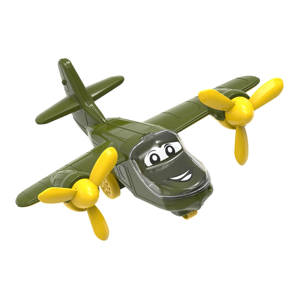 Avion de jucărie colorat, cu design prietenos și elice mobile, ideal pentru jocuri imaginative și dezvoltarea coordonării la copiii mici.