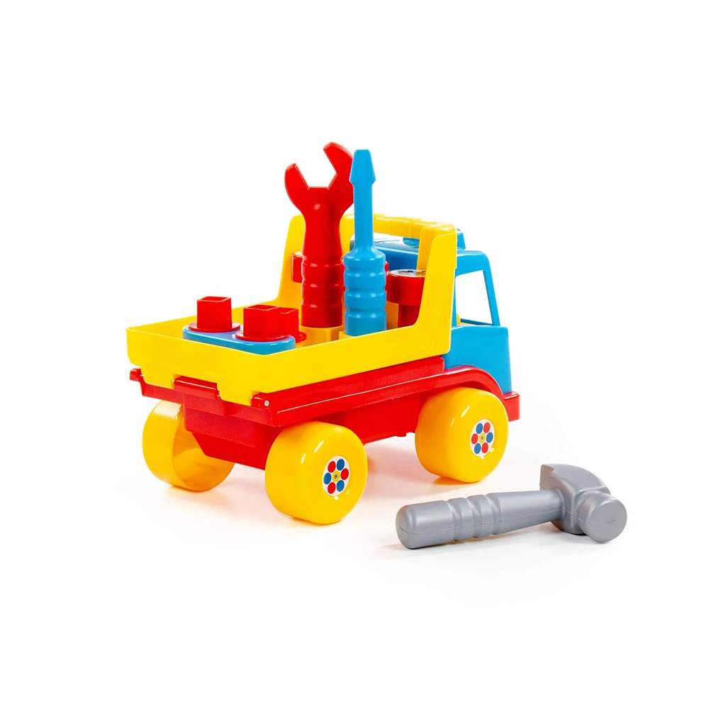 Camionul utilitar cu unelte îi ajută pe cei mici să descopere lumea muncii practice prin joacă. Designul colorat și dimensiunile adaptate copiilor permit o utilizare ușoară atât în interior, cât și afară. Uneltele incluse pot fi scoase și puse la loc, stimulând imaginația și coordonarea mână–ochi.
