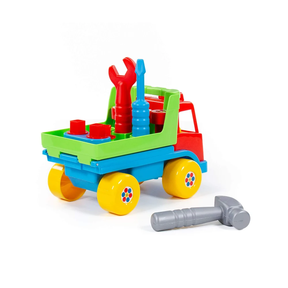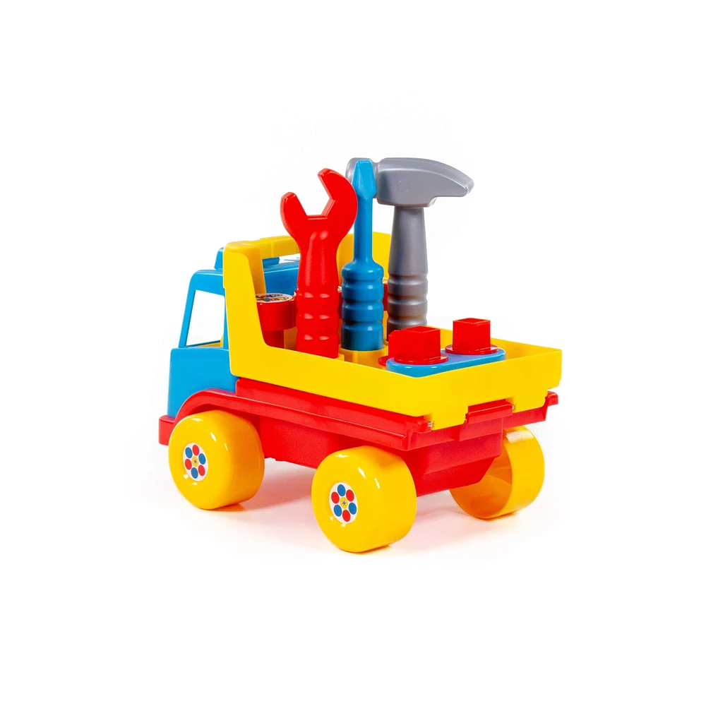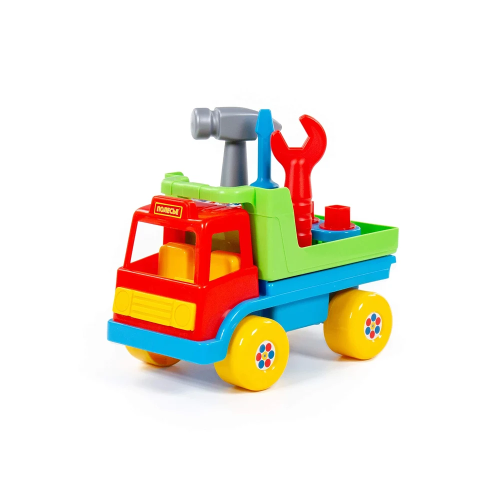 Camion utilitar cu unelte pentru copii, ideal pentru jocuri de rol și distracție activă. Include accesorii de lucru și este realizat din plastic rezistent, sigur pentru cei mici.