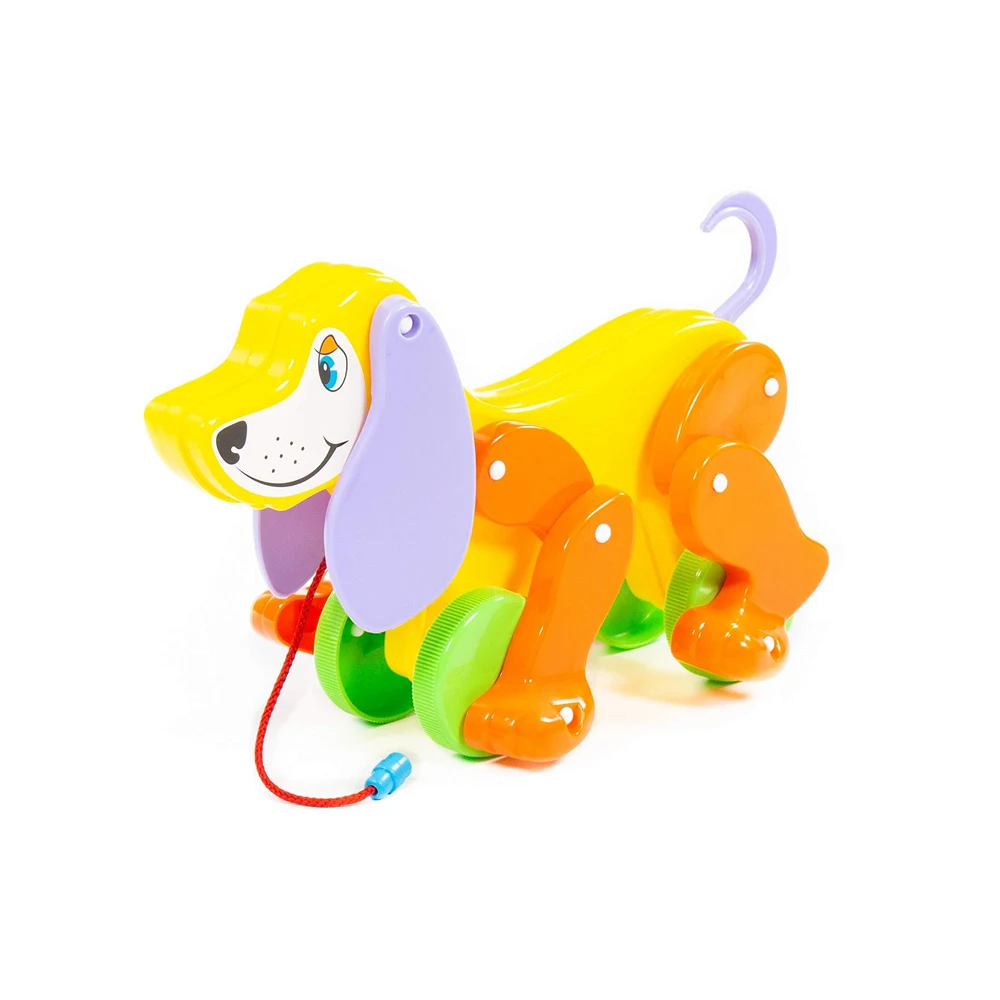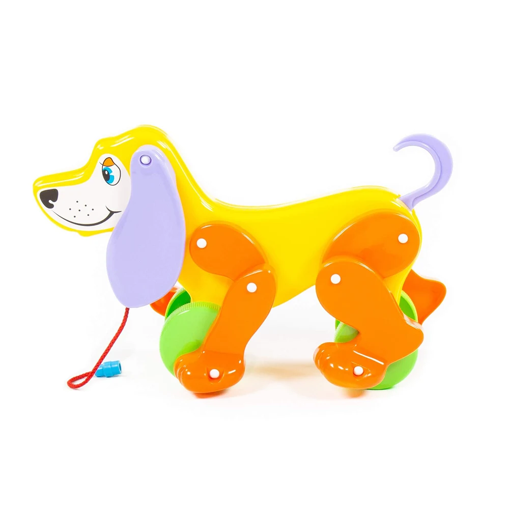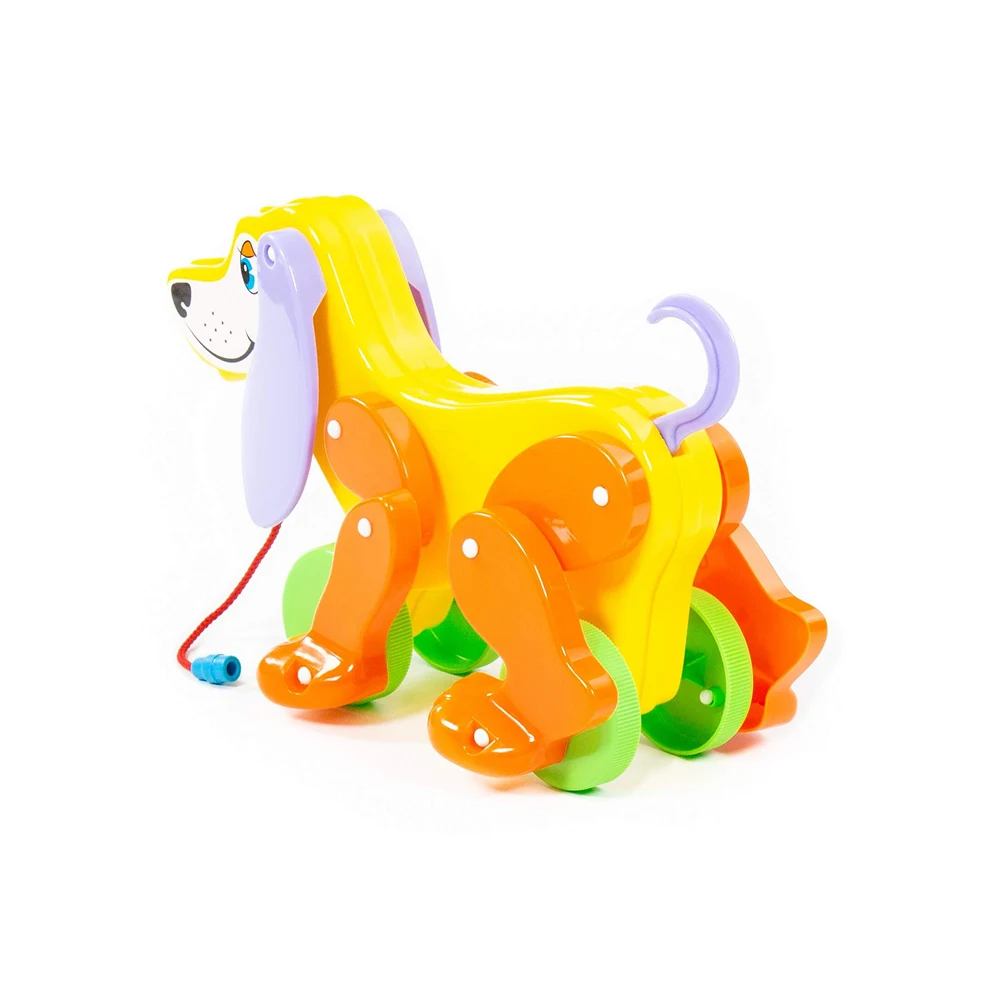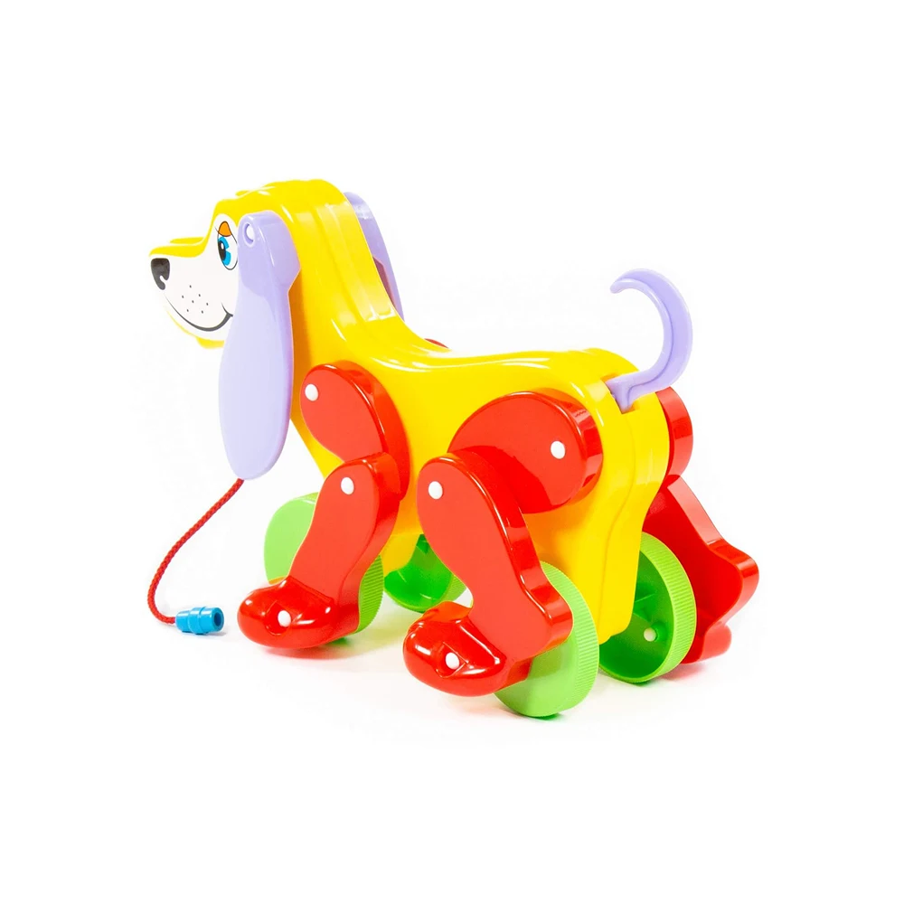 Jucărie de tras în formă de cățeluș, cu roți și șnur, ideală pentru primii pași și joaca activă a copiilor mici.
