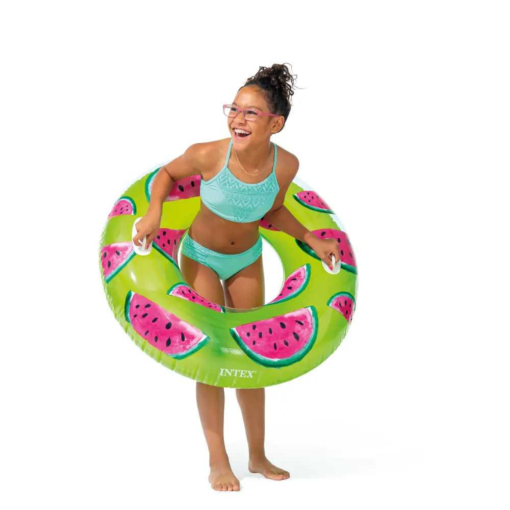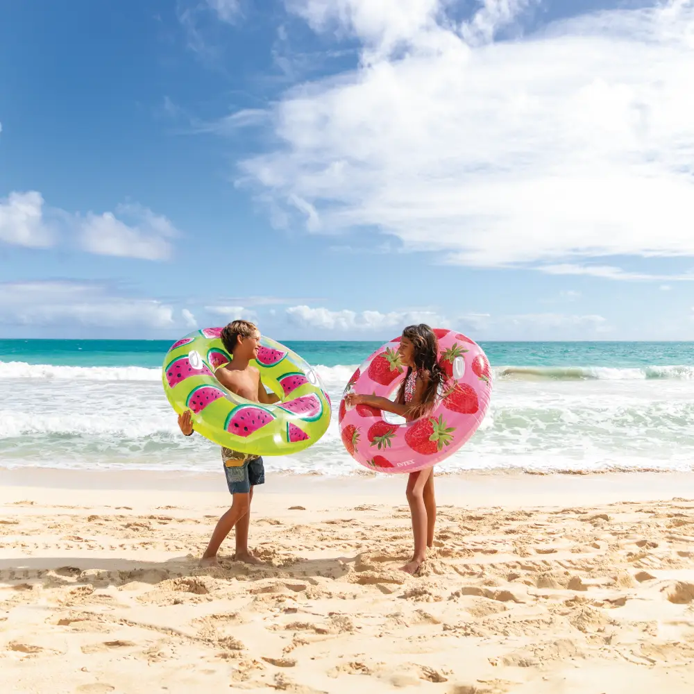 Cele două mânere integrate permit o prindere sigură și un control mai bun în timpul utilizării, oferind stabilitate suplimentară pe apă. Designul decorat cu fructe tropicale este disponibil în 3 culori vibrante, ușor de remarcat în apă. Acest cerc gonflabil susține o greutate de până la 80 kg și este recomandat copiilor peste 9 ani.