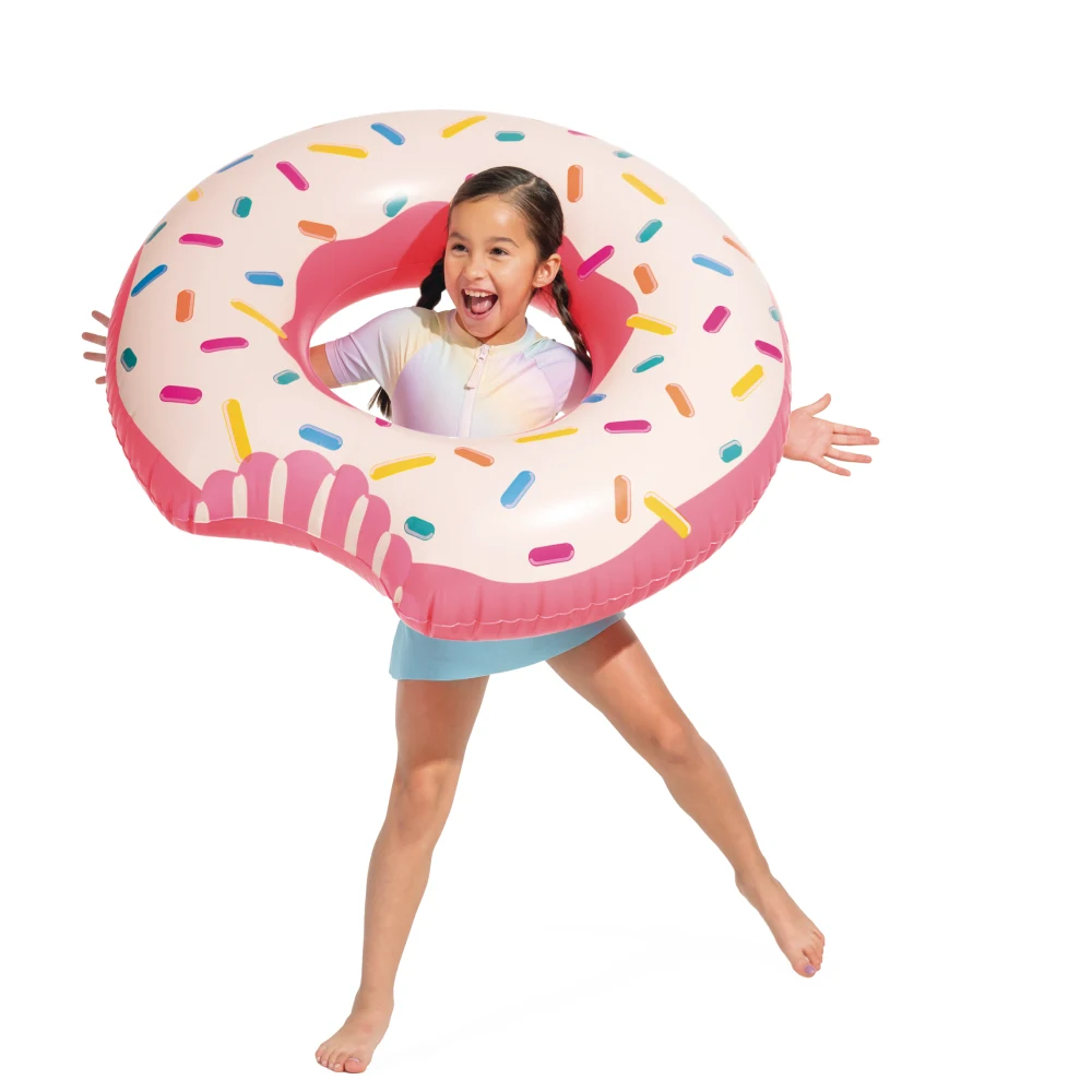 Colac gonflabil de înot cu design tip donut, în culori vesele, ideal pentru distracție și relaxare în apă. Acest cerc gonflabil de 107 cm susține până la 80 kg și este potrivit pentru copii peste 9 ani, fiind recomandat pentru utilizare în piscină sau la mare.