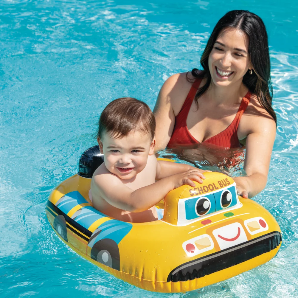 Colac gonflabil cu scaun tip mașinuță, ideal pentru primele bălăceli în piscină sau la mare. Acest cerc gonflabil pentru bebeluși este prevăzut cu scaun integrat și decupaje pentru picioare, oferind stabilitate și poziționare sigură în apă. Recomandat pentru copii de 1–2 ani și până la 15 kg .