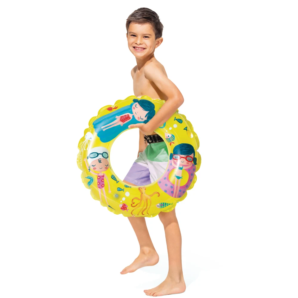 Colac gonflabil transparent cu imprimeu colorat, diametru 61 cm, potrivit pentru copii între 6 și 10 ani. Acest cerc gonflabil susține până la 40 kg și este ideal pentru distracție în piscină sau la mare, oferind vizibilitate bună în apă și confort în timpul utilizării.