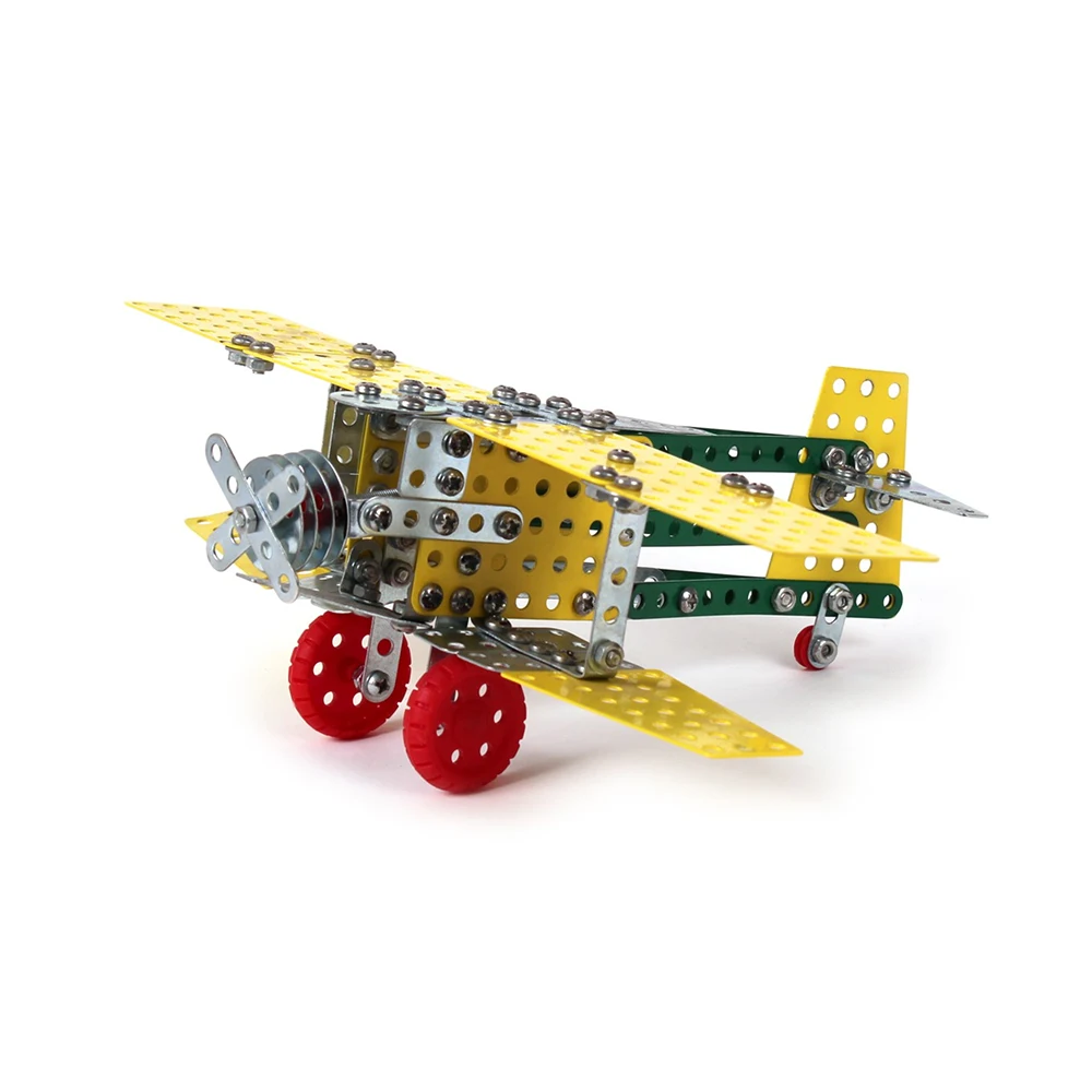 Constructor metalic pentru copii de la 5 ani, cu 260 piese, ideal pentru asamblarea unui avion biplan. Joc educativ care dezvoltă gândirea tehnică și îndemânarea.