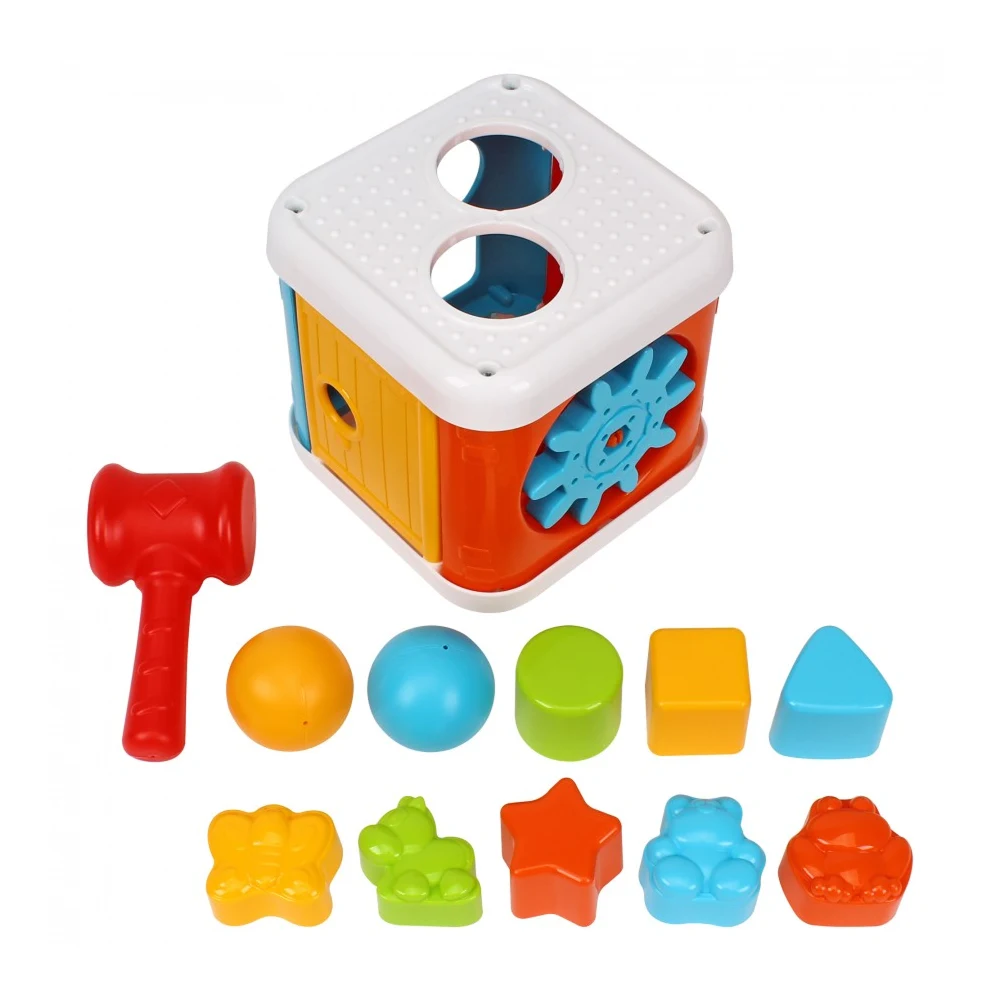 Cubul este prevăzut cu deschideri mari, ușor de utilizat, precum și cu o ușiță laterală care permite recuperarea rapidă a pieselor, menținând interesul copilului pentru joacă. Ciocănelul inclus adaugă un plus de interactivitate și ajută la dezvoltarea coordonării mână–ochi.