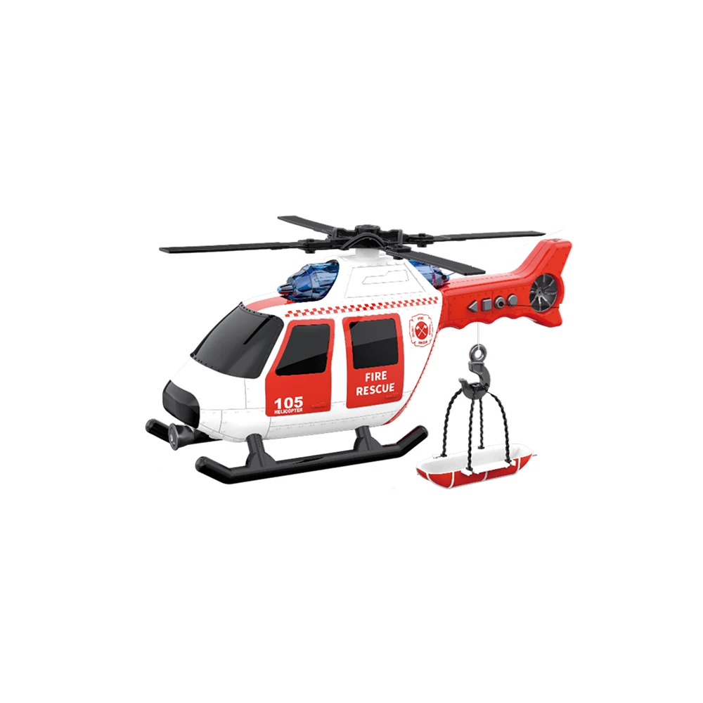 Elicopter de pompieri pentru copii, cu lumini, sunete și troliu funcțional, ideal pentru jocuri de salvare și misiuni de intervenție.