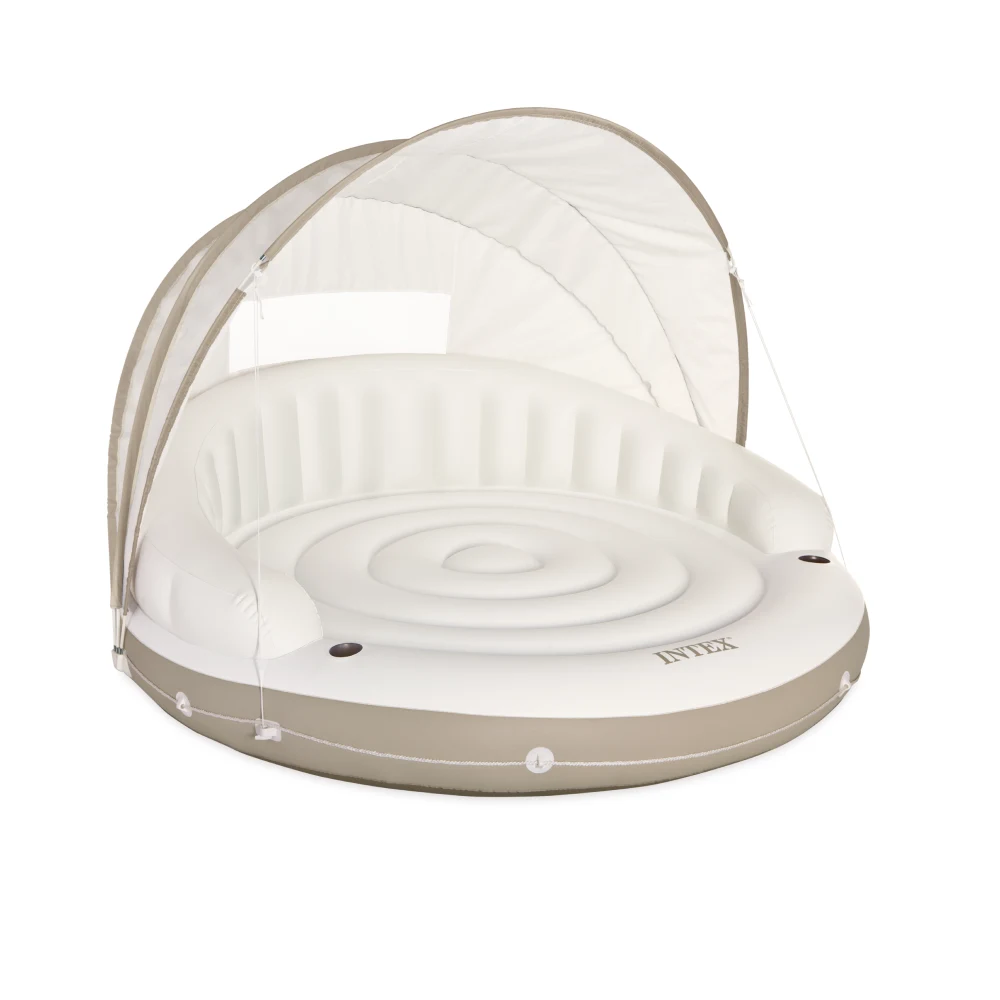 Insulă plutitoare gonflabilă, spațioasă și confortabilă, concepută pentru relaxare pe apă în zilele însorite. Baldachinul detașabil oferă umbră plăcută, iar forma circulară permite utilizarea comodă de către două persoane.
