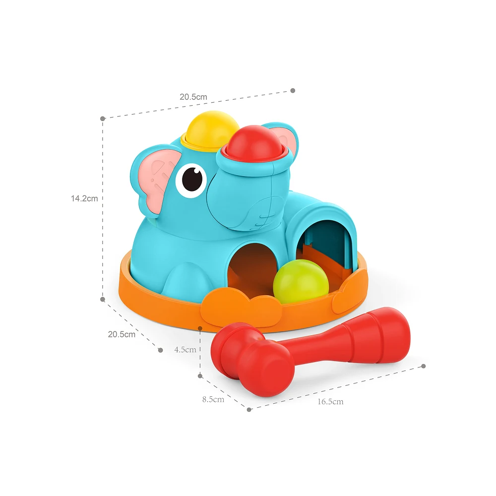 Acest joc educativ cu ciocănel și bile în formă de elefănțel îi invită pe cei mici să descopere relația cauză–efect prin lovirea bilelor colorate și observarea deplasării lor în interiorul jucăriei. Designul prietenos, culorile vii și dimensiunile adaptate pentru mâini mici transformă joaca într-o activitate captivantă și educativă.
