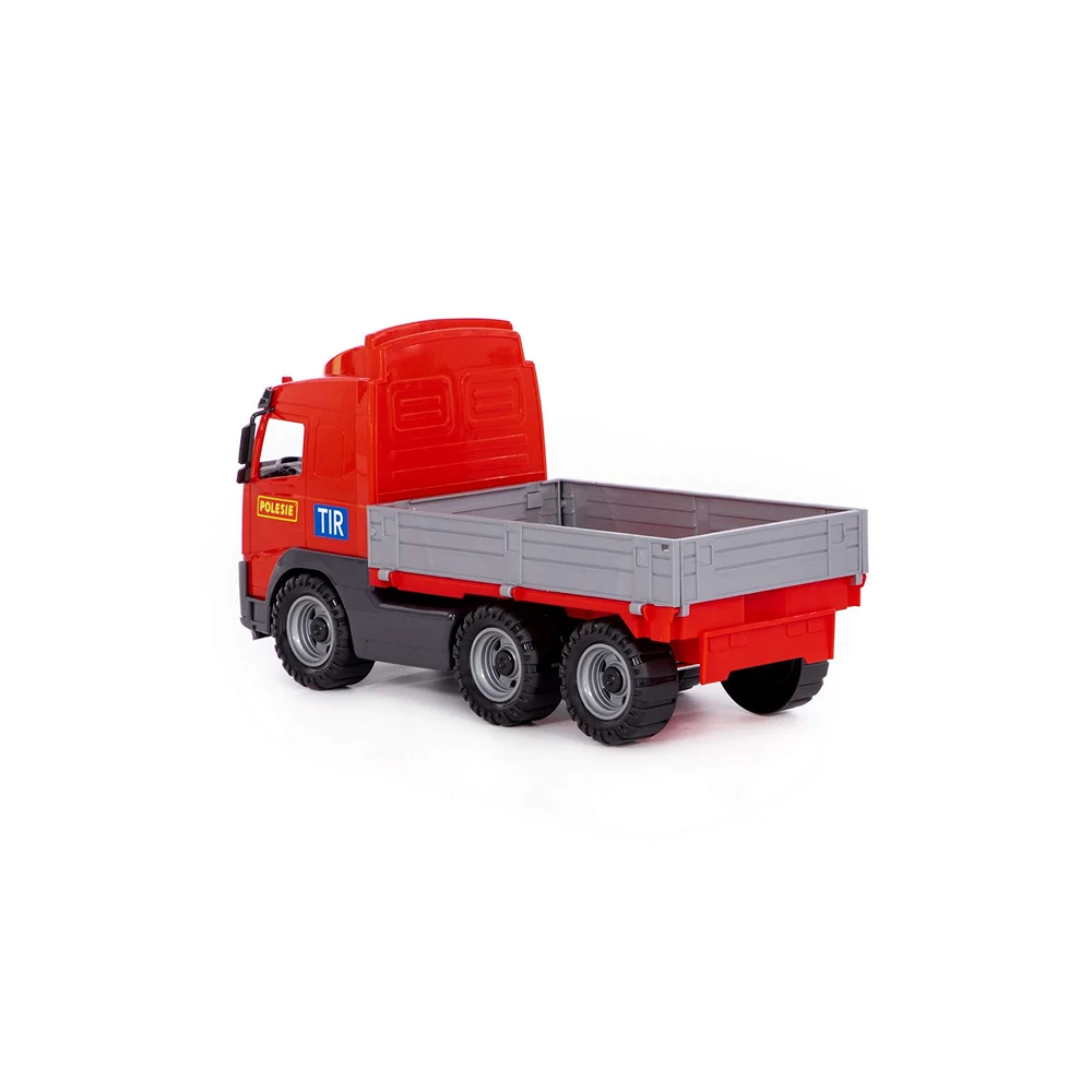 Camion de jucărie cu platformă deschisă, ideal pentru transportul diferitelor obiecte și pentru jocuri de rol inspirate din activitățile reale.