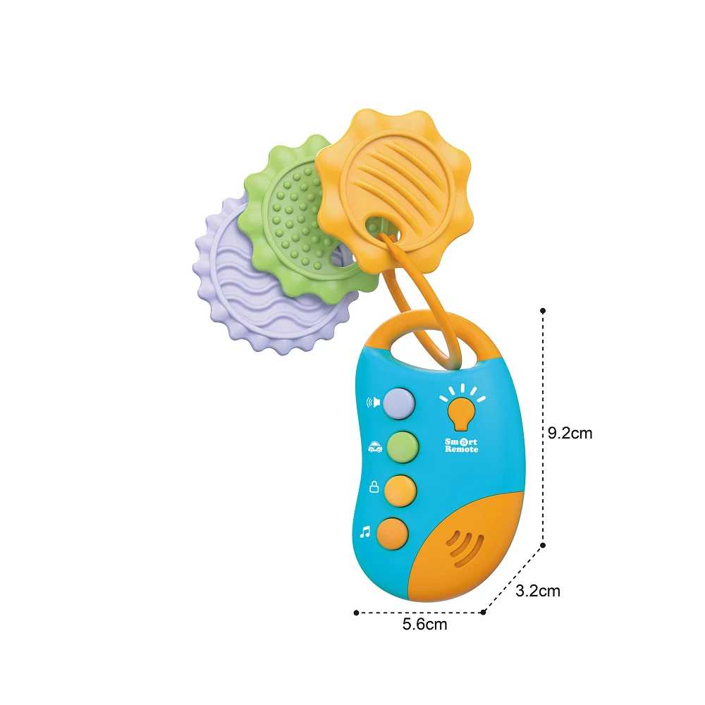 Jucărie muzicală tip cheie auto pentru bebeluși, cu butoane interactive și elemente senzoriale, ideală pentru joacă de imitație și stimulare timpurie.