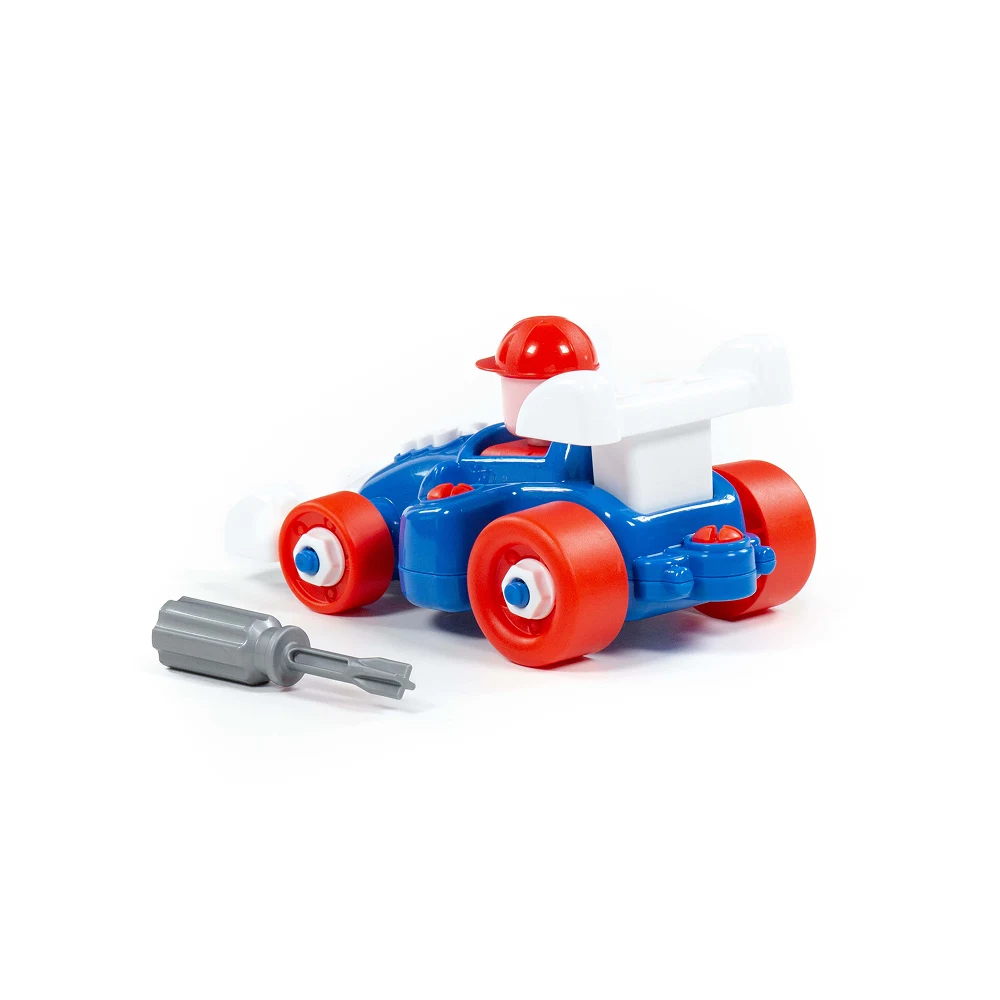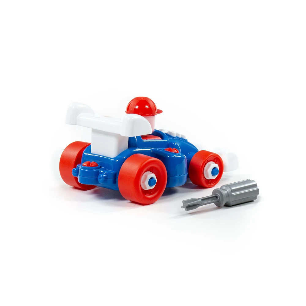 Constructor colorat pentru copii, care permite asamblarea unei mașini de curse. Ideal pentru joacă creativă, dezvoltarea îndemânării și a imaginației.
