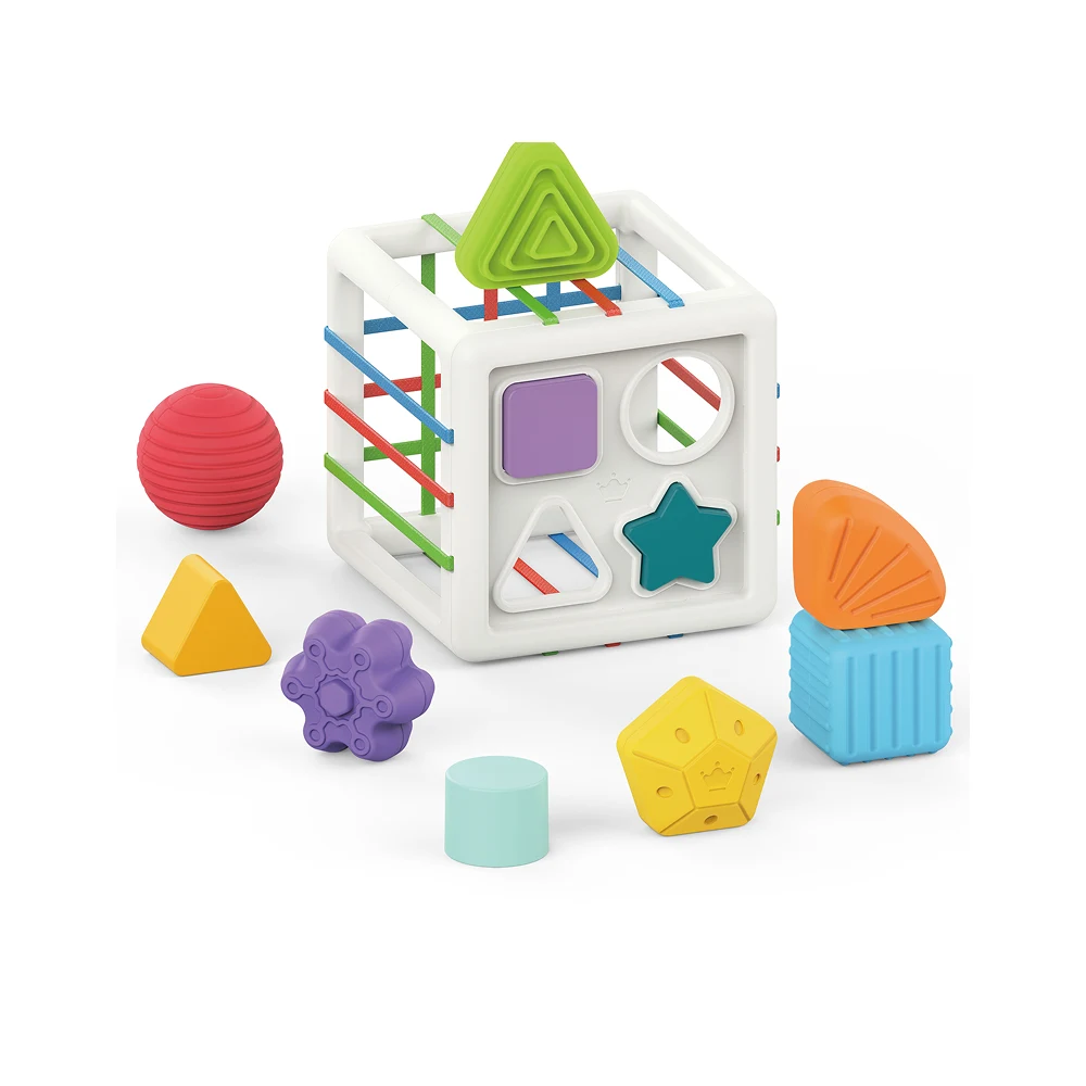 Cub educativ cu sorter de forme și culori, conceput pentru dezvoltarea coordonării, a logicii și a abilităților motorii prin joacă activă.