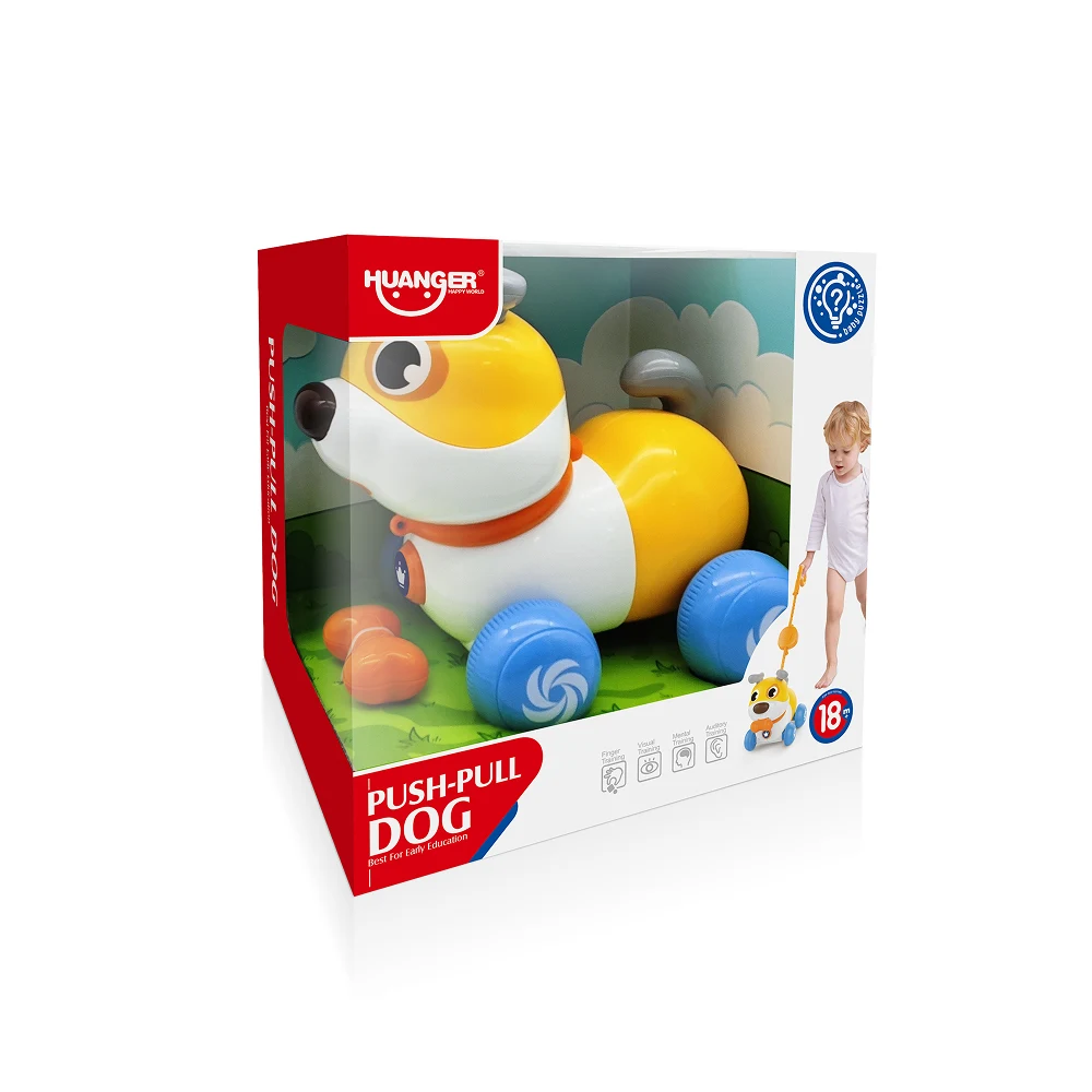 Această jucărie de împins în formă de cățel este concepută pentru a încuraja mișcarea și primii pași ai bebelușilor, transformând procesul de învățare a mersului într-o activitate distractivă. Designul prietenos și culorile vii atrag atenția copilului și îl motivează să împingă jucăria în timpul deplasării.