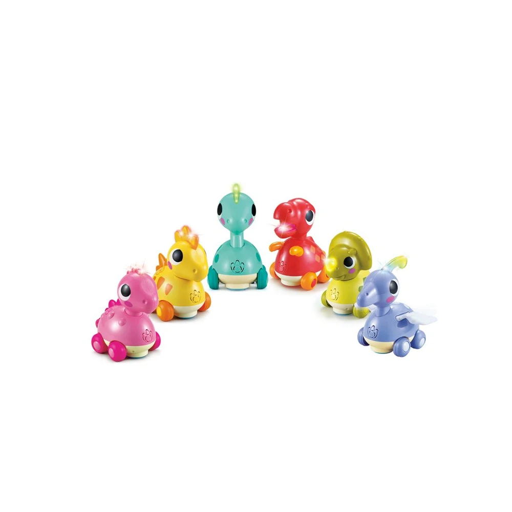 Jucărie interactivă tip dinozaur, cu lumini colorate și sunete, care se mișcă automat și stimulează joaca activă. Disponibilă în 6 modele diferite, ideală pentru dezvoltarea timpurie a copiilor.