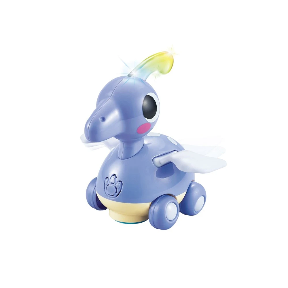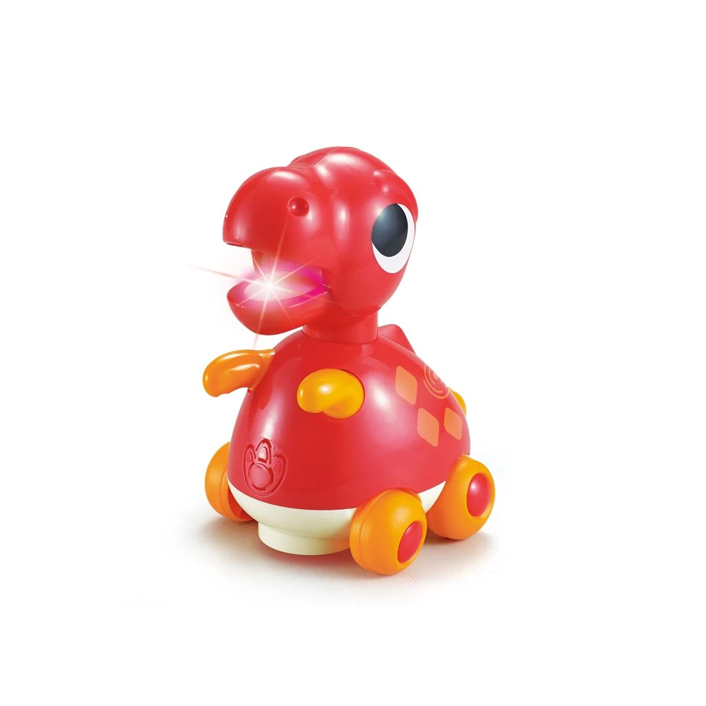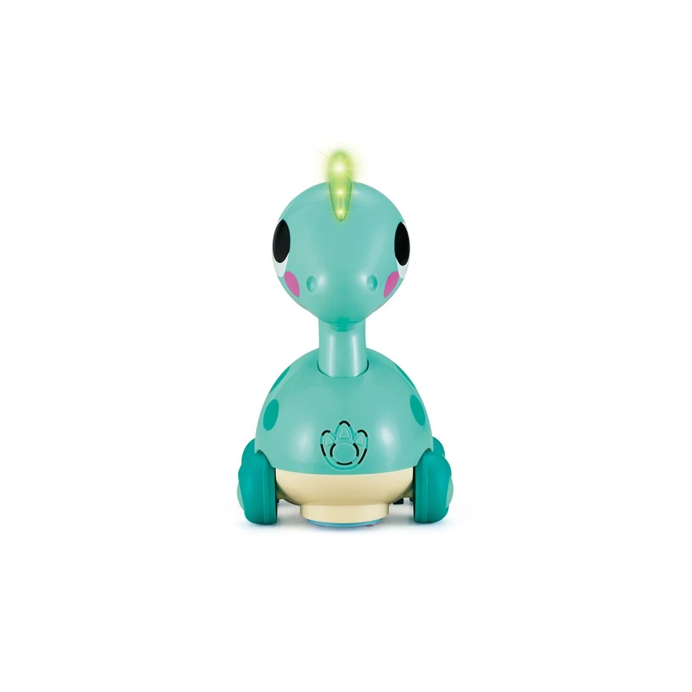 Jucăria este prevăzută cu roți universale și funcție de evitare a obstacolelor, schimbând direcția atunci când întâlnește un obiect. Este ideală pentru stimularea mersului de-a bușilea, a coordonării și a dezvoltării musculaturii. Capul dinozaurului se luminează în timpul funcționării, iar volumul este moderat pentru a nu deranja auzul copilului.