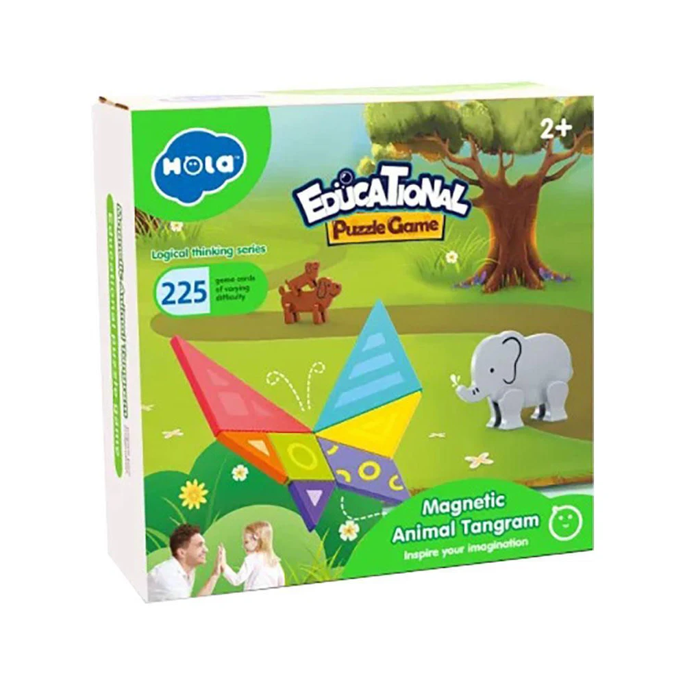 Joc educativ de tip tangram cu piese magnetice și figurine de animale, conceput pentru dezvoltarea logicii, imaginației și gândirii spațiale la copii.