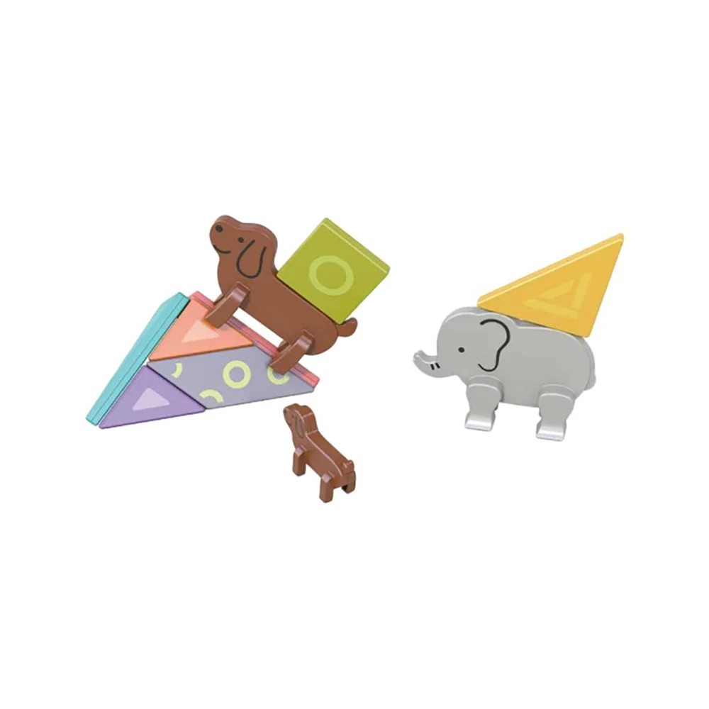 Jocul include provocări cu forme 2D și posibilitatea de explorare a conceptelor 3D prin combinarea pieselor și a figurinelor de animale. Activitățile propuse contribuie la dezvoltarea gândirii logice, a percepției spațiale și a coordonării mână-ochi.