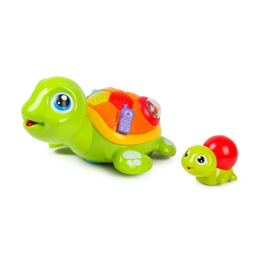 Această jucărie interactivă tip broască țestoasă este creată pentru a oferi ore întregi de distracție și învățare prin joacă. Datorită senzorilor integrați, jucăria reacționează la atingere, mișcare și interacțiune, redând sunete vesele, melodii și efecte luminoase.