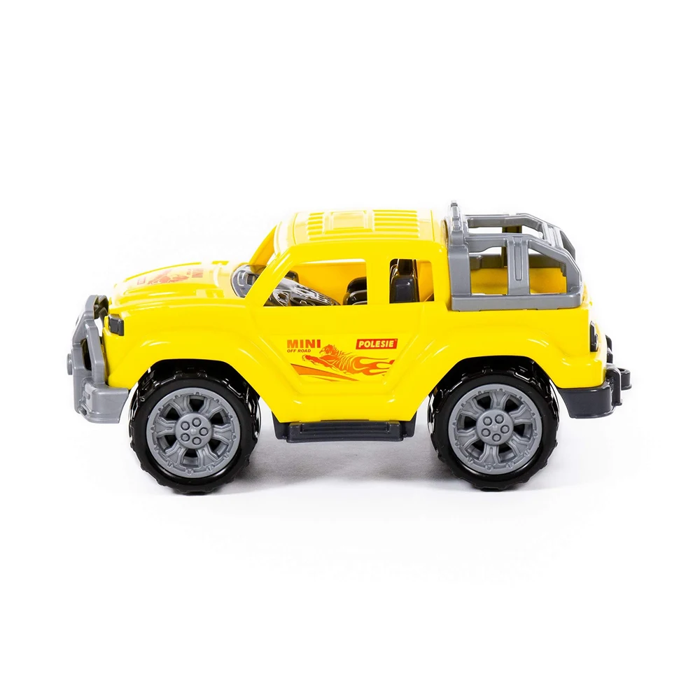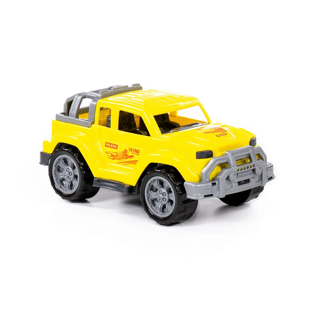 Mașină de jucărie tip off-road, în variantă mini, cu design robust și culoare galbenă atractivă, ideală pentru jocuri dinamice și pline de aventură.