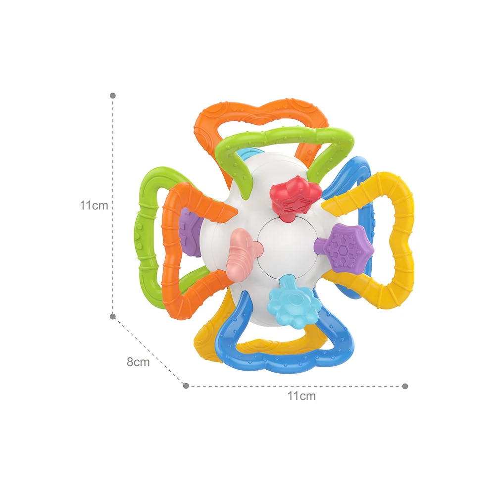 Această minge senzorială este special concepută pentru joaca timpurie a bebelușilor, având o formă ușor de apucat și multiple elemente interactive. Structura deschisă permite prinderea facilă cu mâinile mici, contribuind la dezvoltarea coordonării mână-ochi și a motricității fine.
