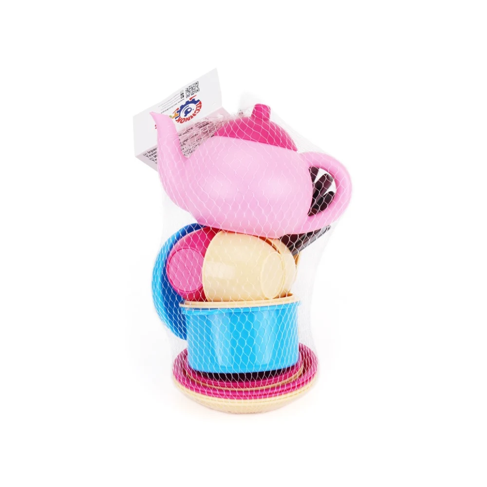 Set de veselă de jucărie pentru copii, ideal pentru jocuri de rol precum gătitul și servirea mesei. Include accesorii esențiale pentru joacă zilnică, în culori plăcute și ușor de recunoscut.