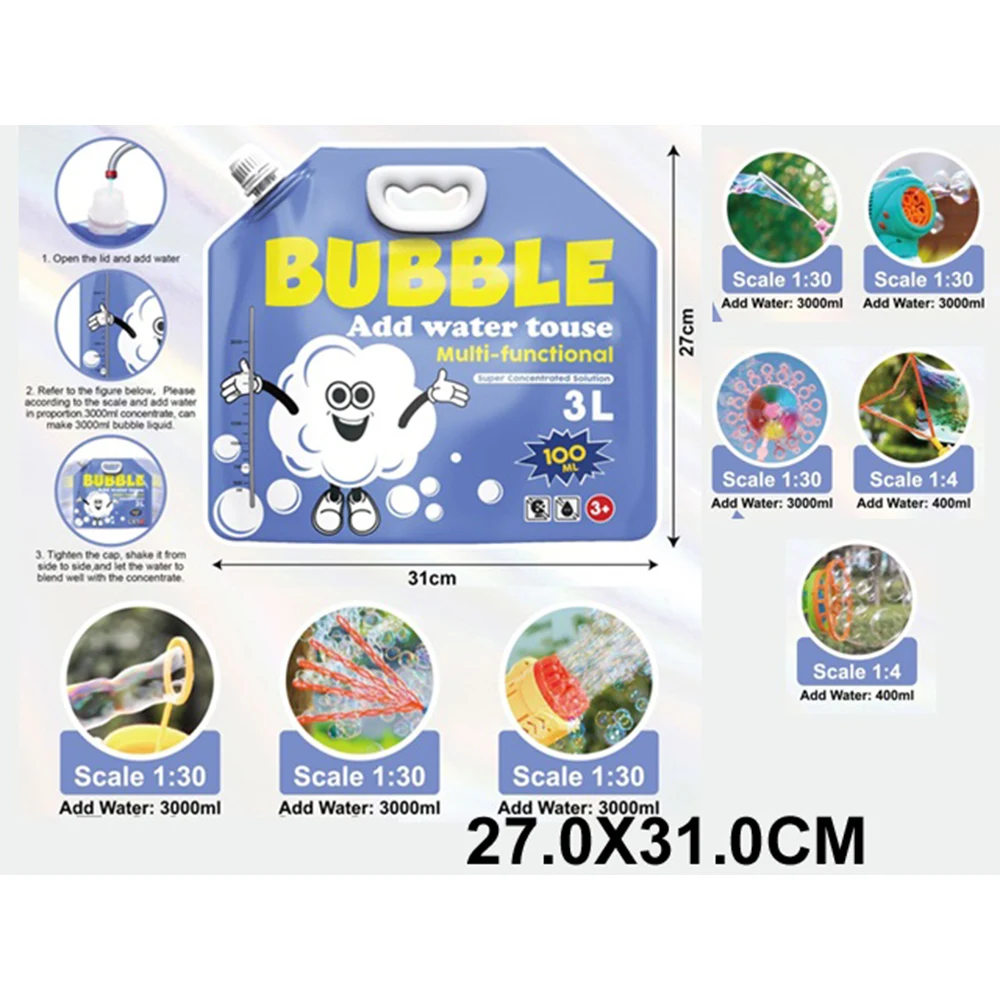 Cu ajutorul soluției speciale și al baghetei incluse, pot fi create bule mari și colorate care plutesc ușor în aer.