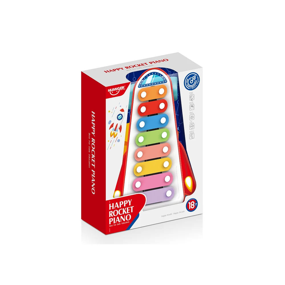 Acest xilofon muzical tip rachetă este o jucărie ideală pentru primele experiențe muzicale ale bebelușilor. Designul vesel, în formă de rachetă, și clapele colorate atrag atenția copilului și îl încurajează să exploreze sunetele prin joacă activă.