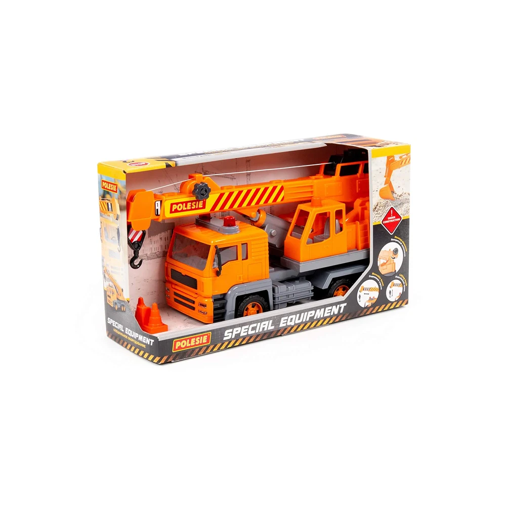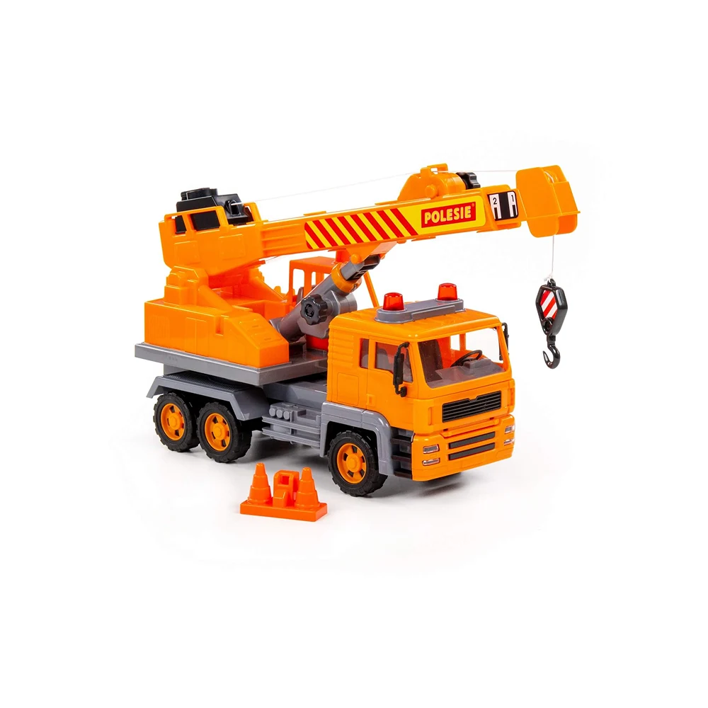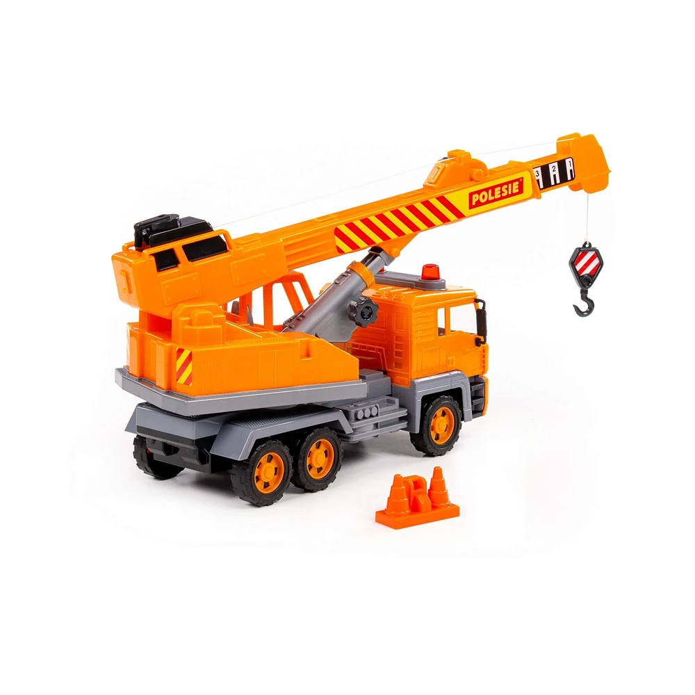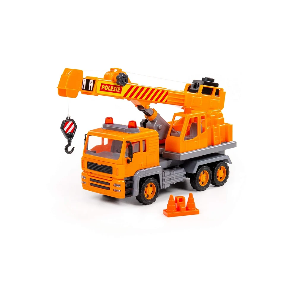 Macara cu inerție pentru copii, cu braț extensibil și cârlig funcțional, ideală pentru jocuri de construcție și șantier.