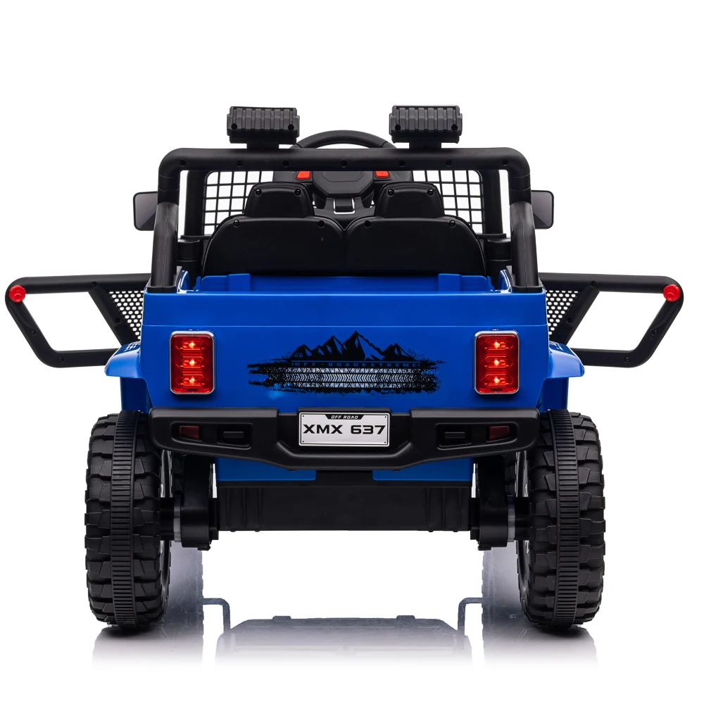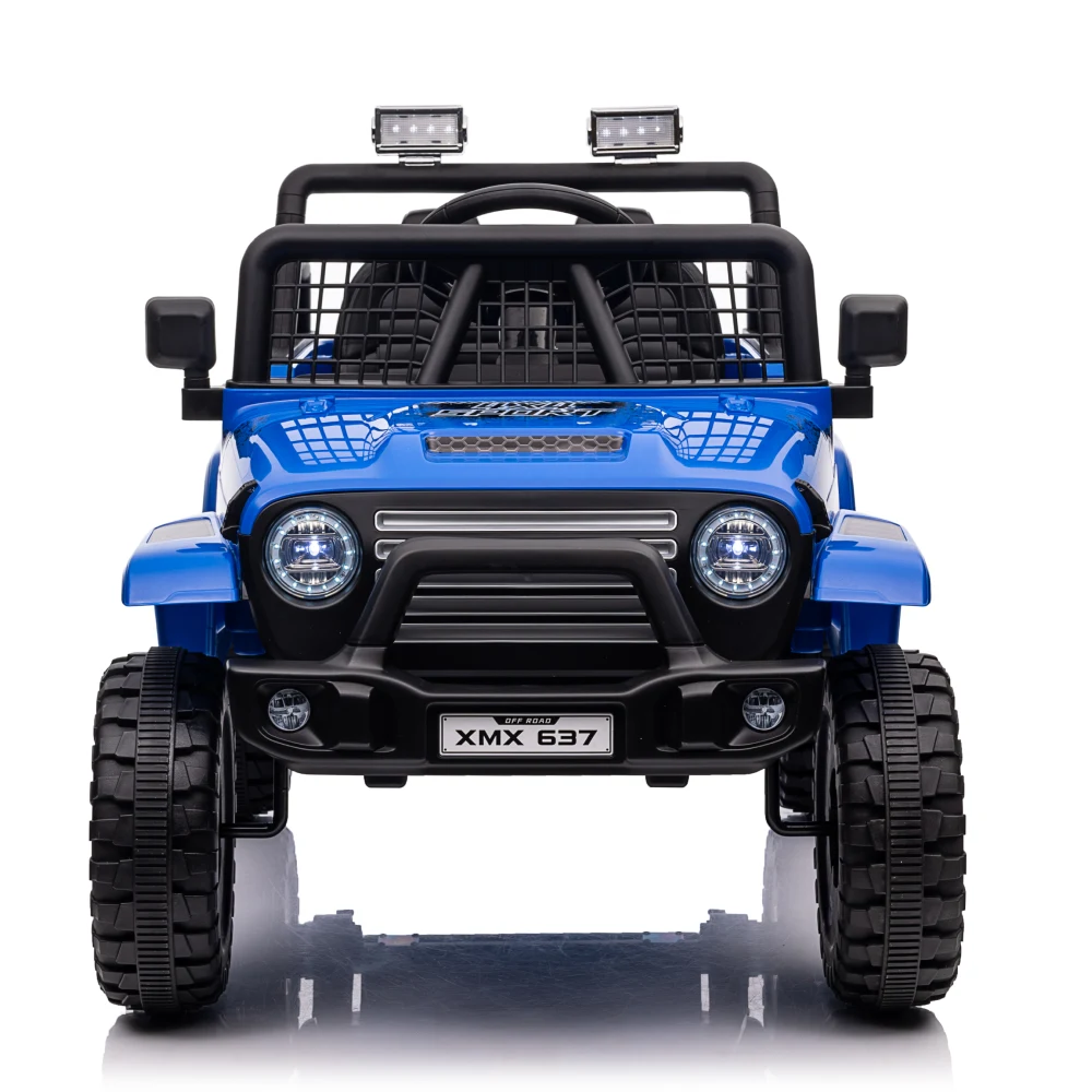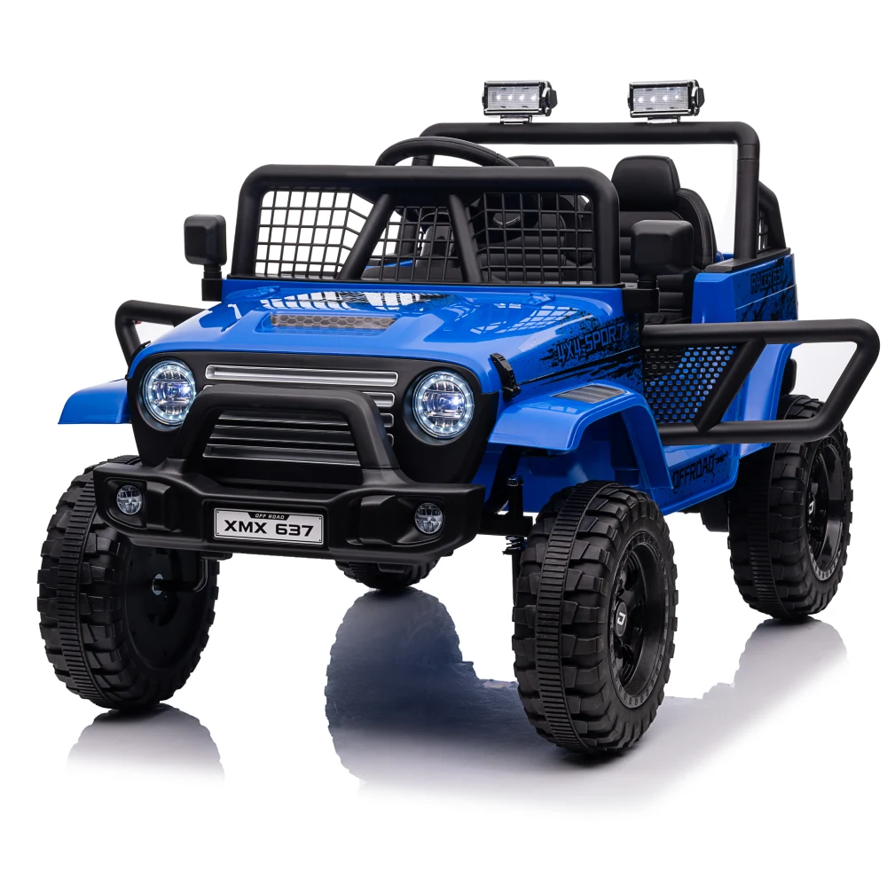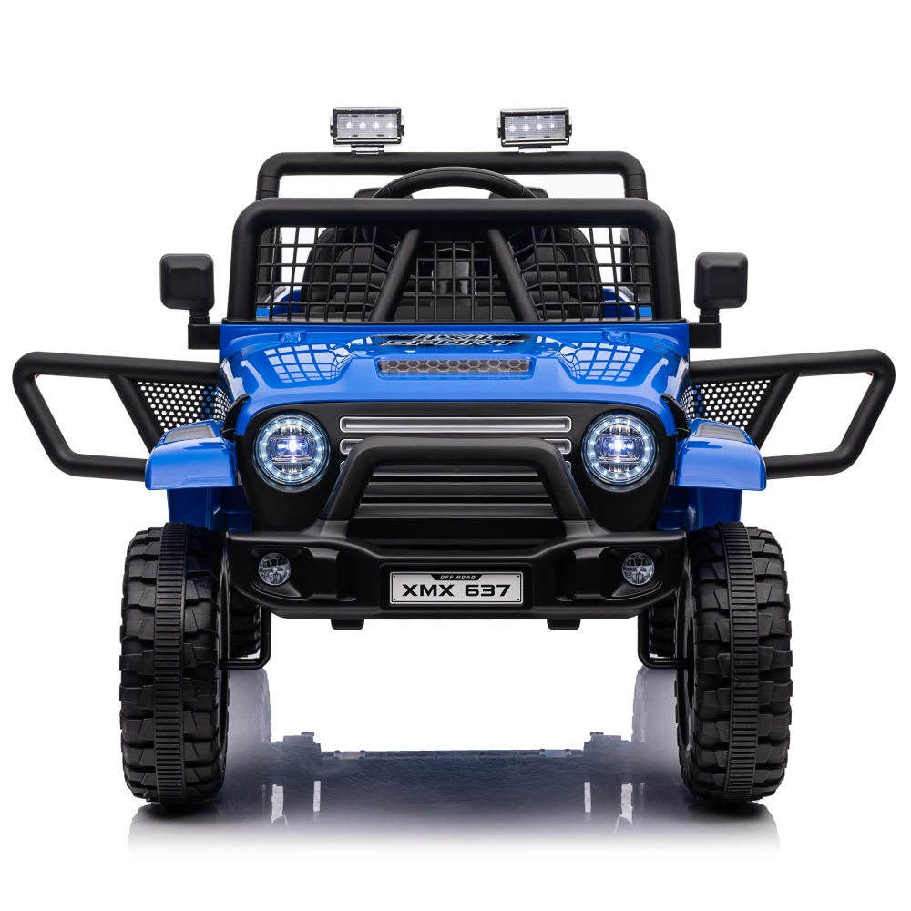 Mașina electrică pentru copii off-road impresionează prin designul robust, inspirat din modelele clasice de tip jeep, fiind pregătită pentru plimbări pline de aventură. Detaliile frontale, barele de protecție și proiectoarele superioare oferă un aspect puternic și realist.