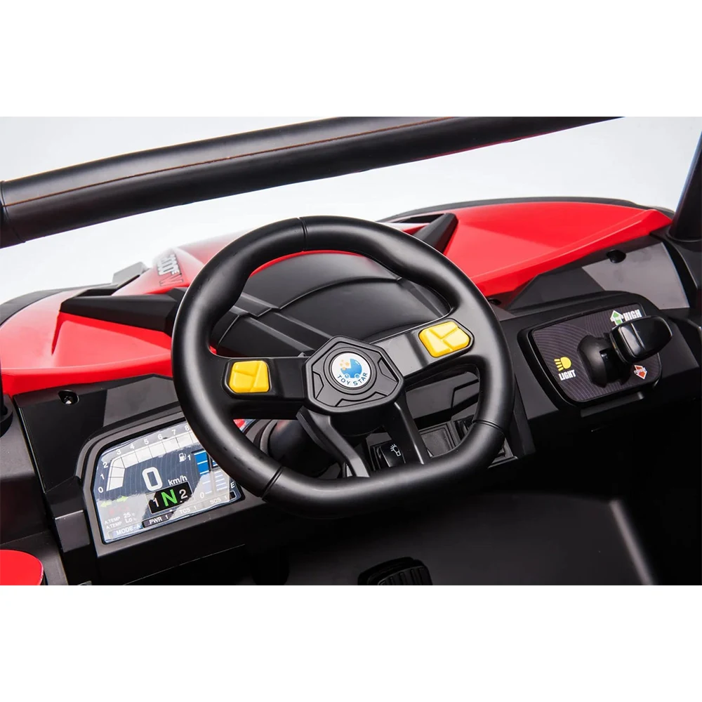 Mașina electrică pentru copii UTV impresionează prin designul sport și liniile agresive, inspirate din vehiculele off-road moderne. Aspectul dinamic și roțile late oferă stabilitate bună și o experiență de condus plină de energie.