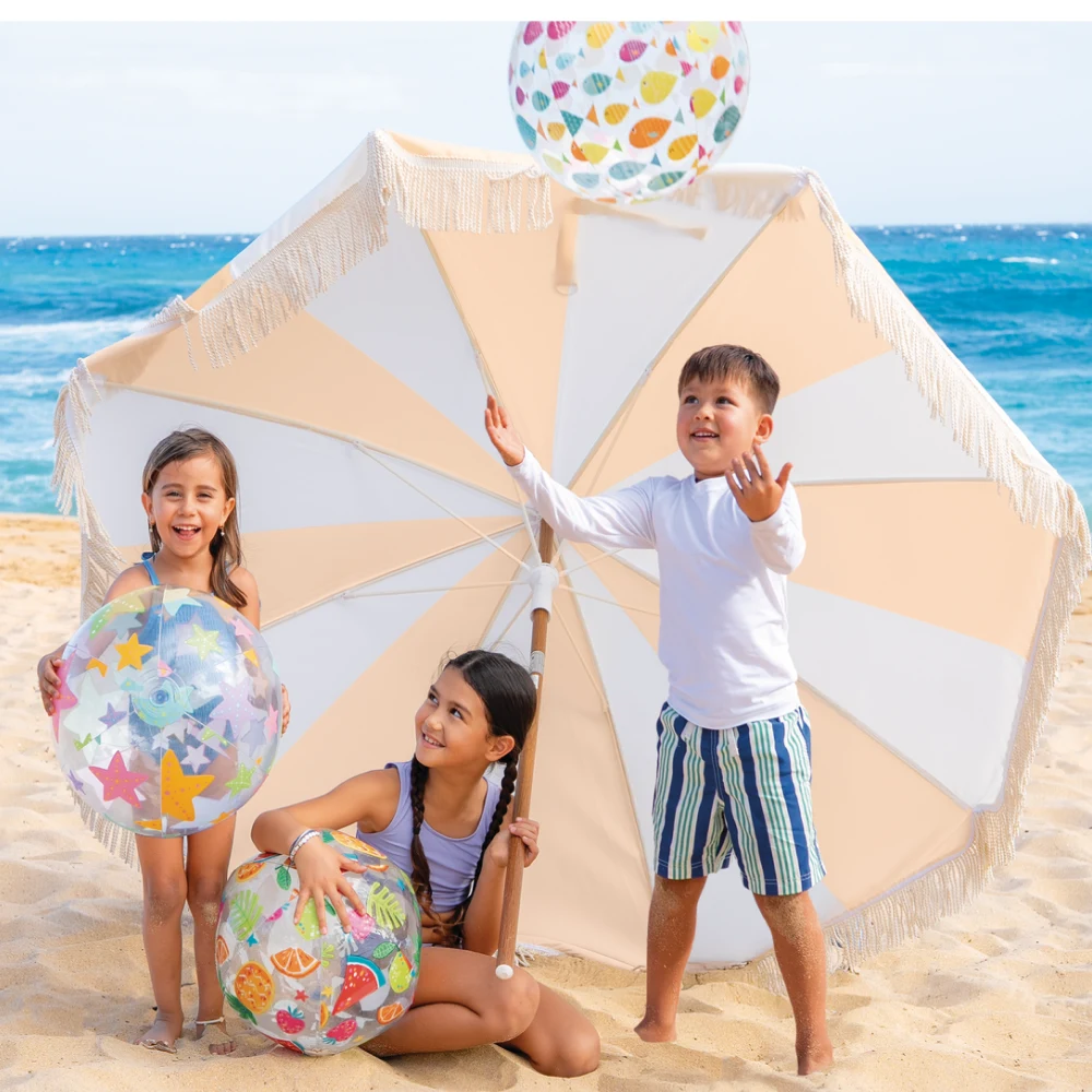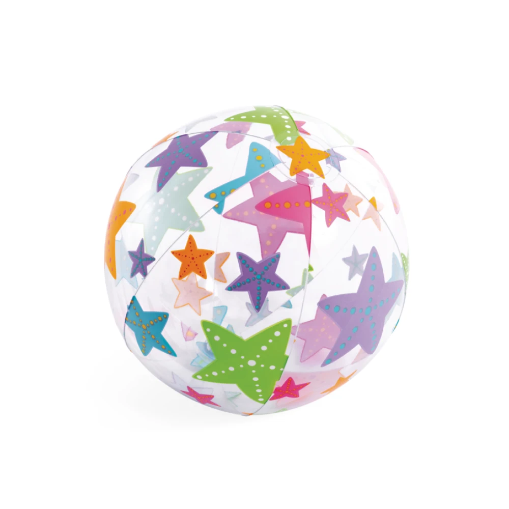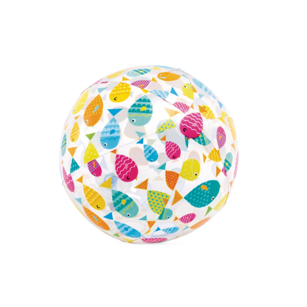 Minge gonflabilă de plajă, cu imprimeu colorat, ideală pentru joacă activă la plajă, piscină sau în aer liber. Ușoară, practică și atractivă pentru copii.