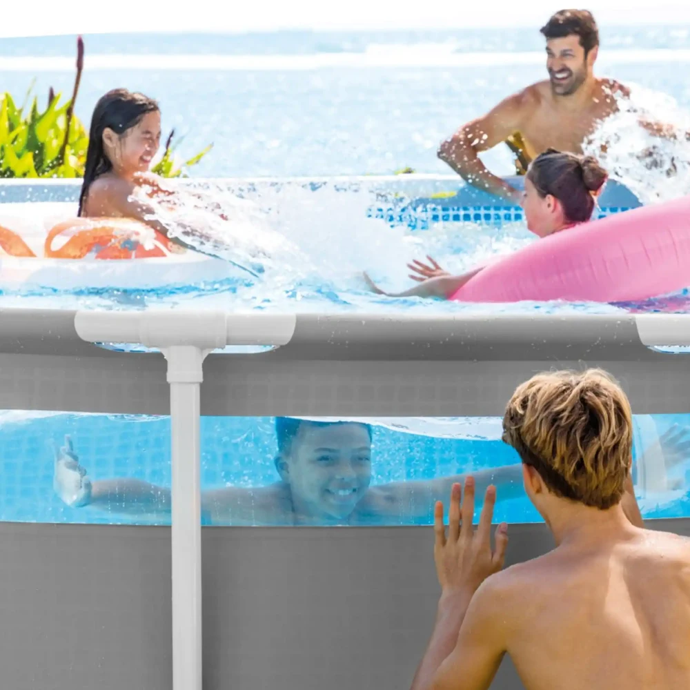 Piscină cu cadru metalic rotundă 427 cm, capacitate 12706 L, Intex Prism Frame Clearview, cu pompă 3785 L/h, set complet. Ideală pentru familie.