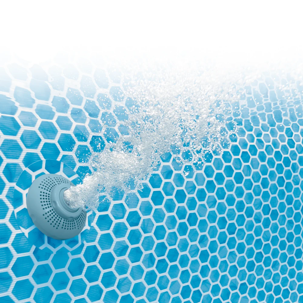 Pereții piscinei sunt fabricați din material PVC armat în 3 straturi, cu strat intermediar din poliester, ceea ce conferă rezistență sporită la presiunea apei, impact și uzură zilnică. Banda perimetrală de susținere contribuie la menținerea formei și la stabilitatea suplimentară a ansamblului.