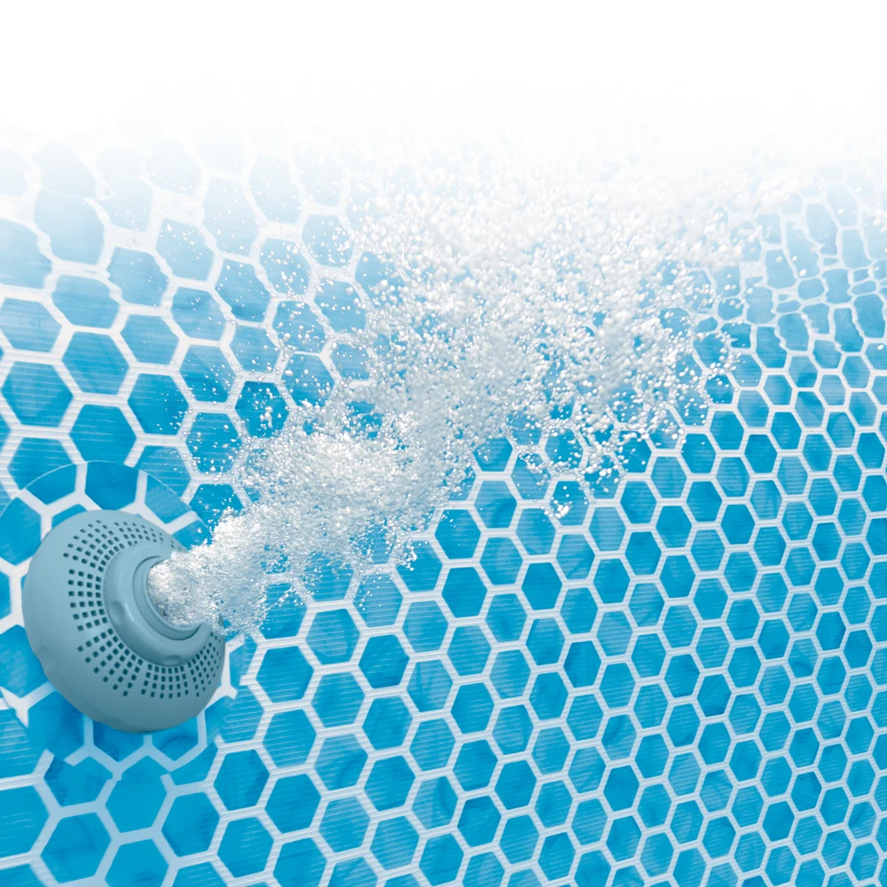 Pereții sunt fabricați cu tehnologia SUPER-TOUGH™, material PVC laminat în 3 straturi, cu plasă din poliester între straturi, ceea ce oferă rezistență sporită la presiunea apei, perforare și uzură sezonieră.
