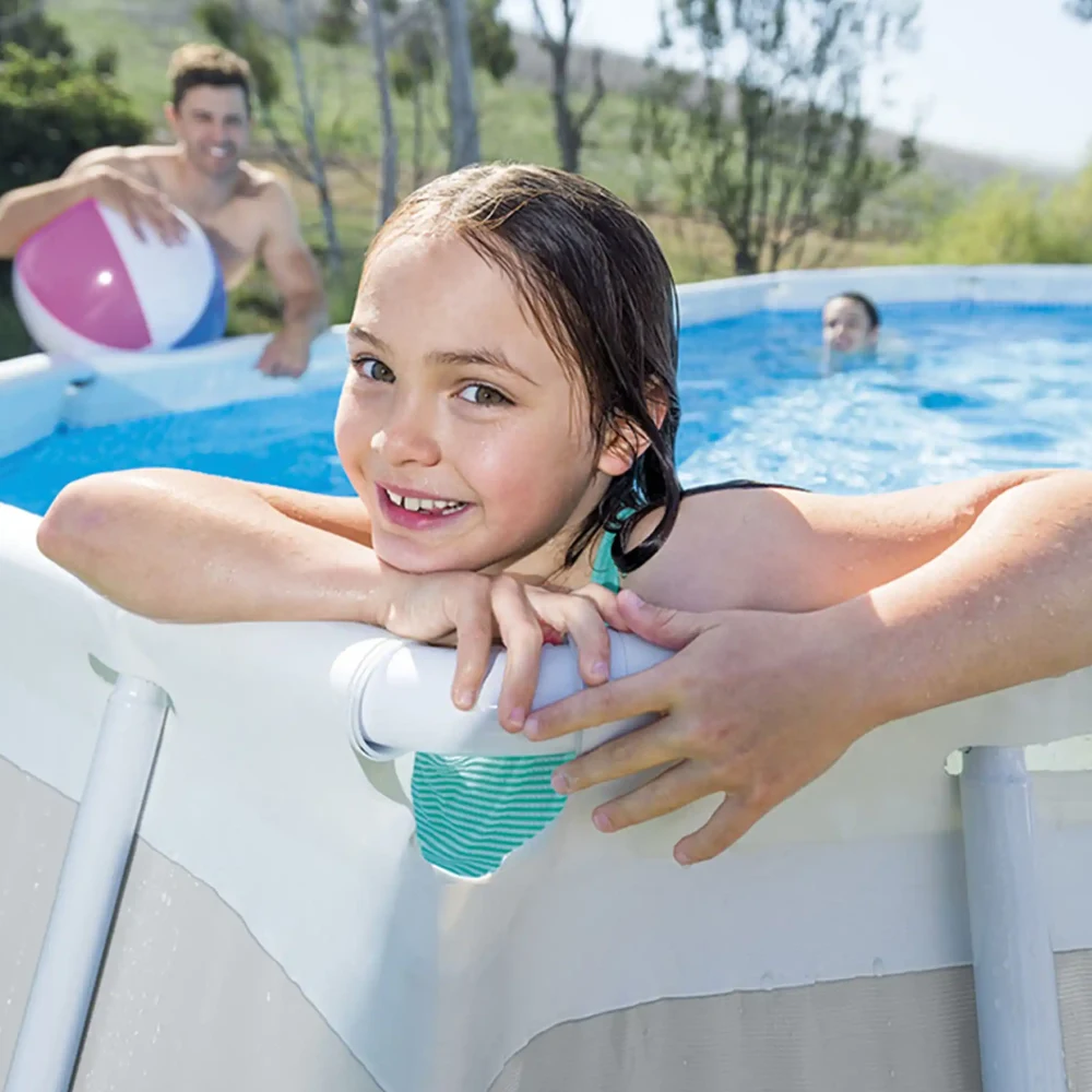 Piscina cu cadru metalic este proiectată pentru utilizare sezonieră în familie, oferind un spațiu generos pentru înot, joacă și relaxare. Forma ovală permite o distribuție eficientă a apei și ocupă mai puțin spațiu în curte comparativ cu modelele rotunde de volum similar, fiind potrivită pentru grădini medii și mari.
