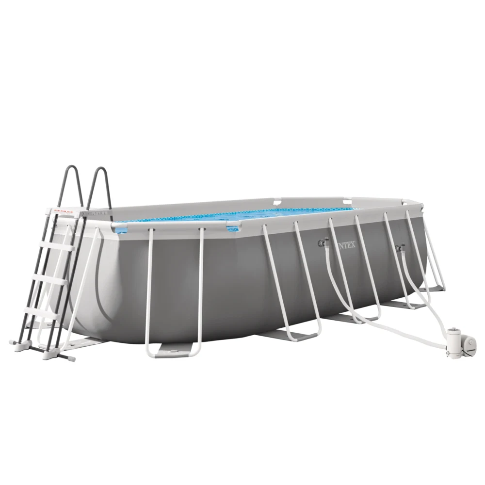 Structura este realizată din oțel galvanizat tratat anticoroziv, iar sistemul de susținere perimetral asigură stabilitate pe întreaga lungime a piscinei. Pereții sunt fabricați cu tehnologia SUPER-TOUGH™, material laminat în 3 straturi – două straturi de PVC durabil și un strat intermediar din poliester – pentru rezistență sporită la presiunea apei și utilizare repetată pe durata sezonului cald.