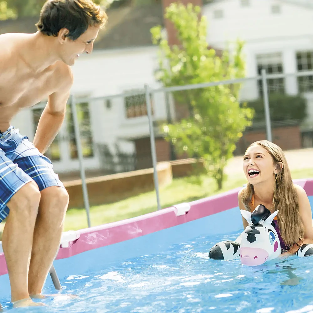 Piscina dreptunghiulară cu cadru metalic este concepută pentru utilizare sezonieră în curte sau grădină, oferind stabilitate și rezistență în timpul utilizării. Structura este realizată din cadru metalic solid din oțel galvanizat, tratat pentru protecție împotriva ruginii și coroziunii, asigurând o susținere sigură a pereților și menținerea formei piscinei la umplere.