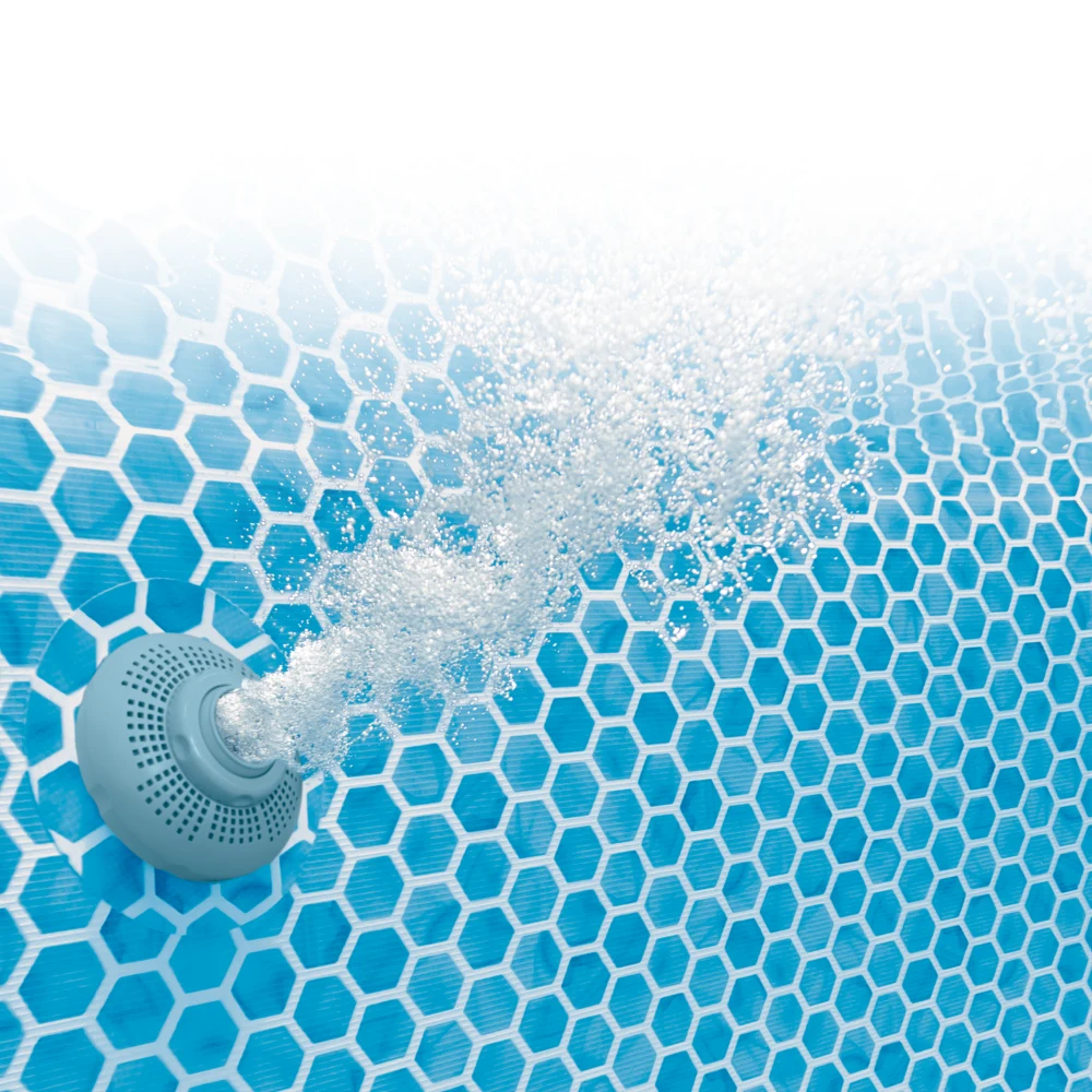 Modelul este echipat cu pompă de filtrare cu cartuș, debit 1250 l/h, care contribuie la menținerea apei curate prin recirculare constantă. Conectarea se realizează prin furtunuri fixate sigur pentru funcționare stabilă.