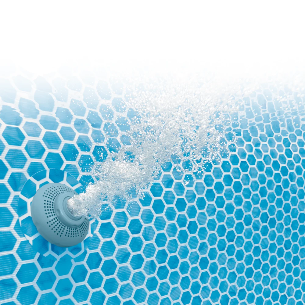 Capacitatea piscinei este de 3077 L la 80% umplere, oferind spațiu confortabil pentru relaxare și distracție în familie în zilele călduroase. Modelul este echipat cu pompă de filtrare cu cartuș, debit 1250 l/h, care asigură recircularea și menținerea apei curate. Pompa se conectează ușor la piscină prin furtunuri fixate sigur, fiind simplă și fiabilă în exploatare.