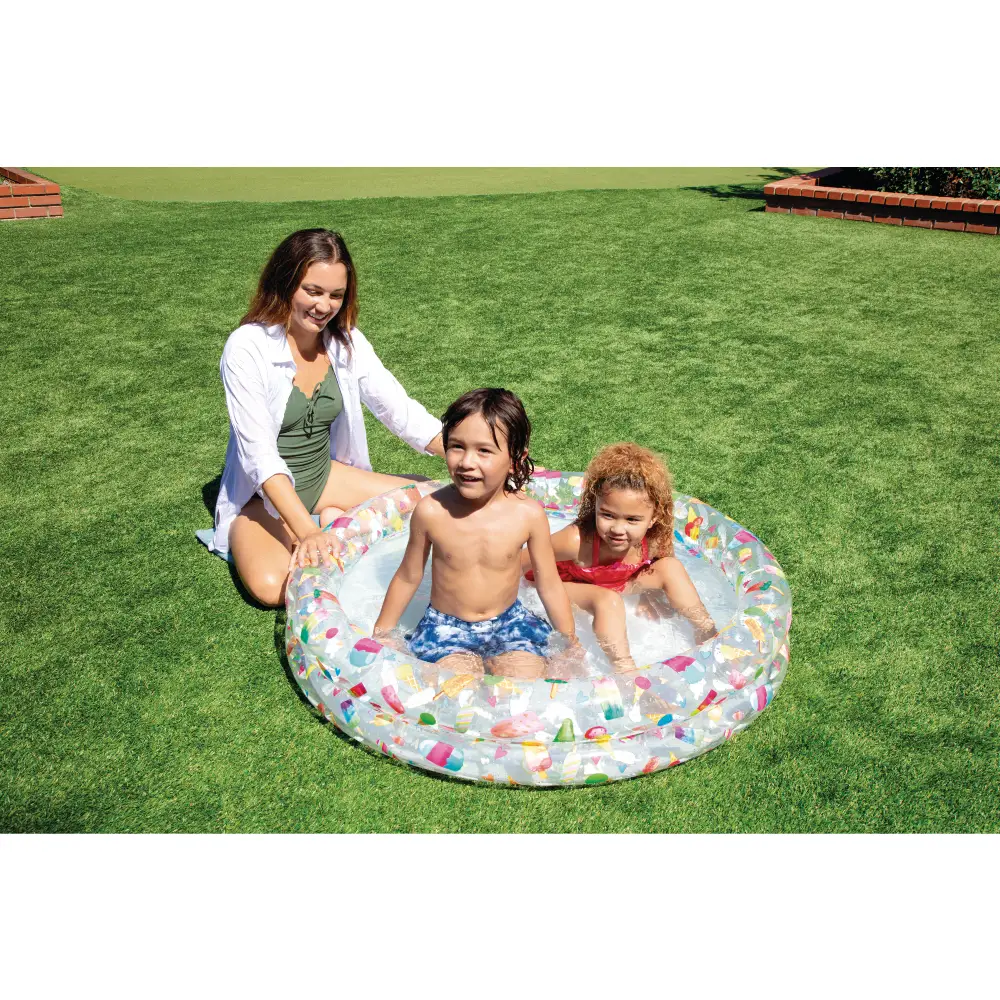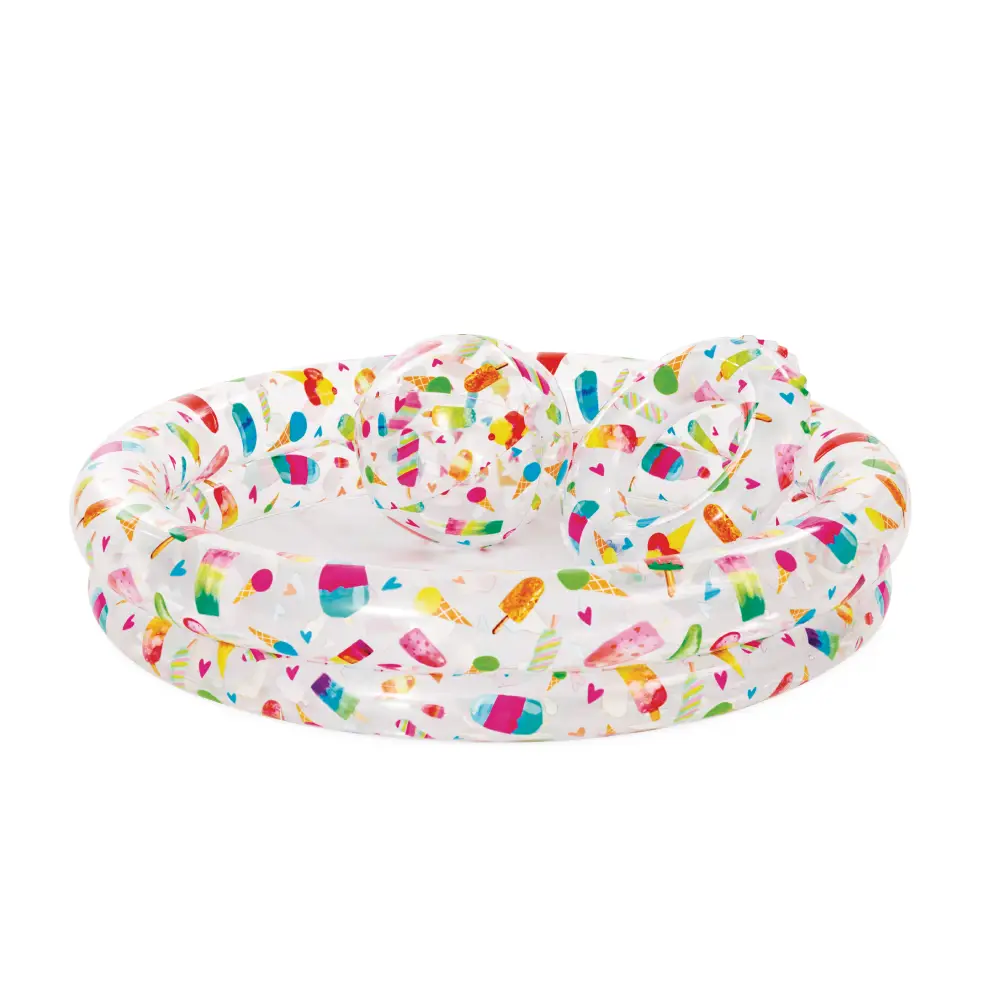 Piscină gonflabilă Ice Pop cu minge și colac incluse, ideală pentru distracție în zilele călduroase. Cu o capacitate de 150 L și pereți confortabili, oferă spațiu suficient pentru joacă și răcorire, fiind potrivită pentru utilizare în curte sau grădină.