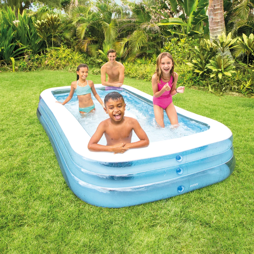 Piscina gonflabilă este concepută pentru momente de relaxare și distracție în familie, oferind un spațiu generos pentru răcorire în zilele toride de vară. Designul în nuanțe de albastru oferă un aspect plăcut și potrivit pentru orice curte sau grădină.