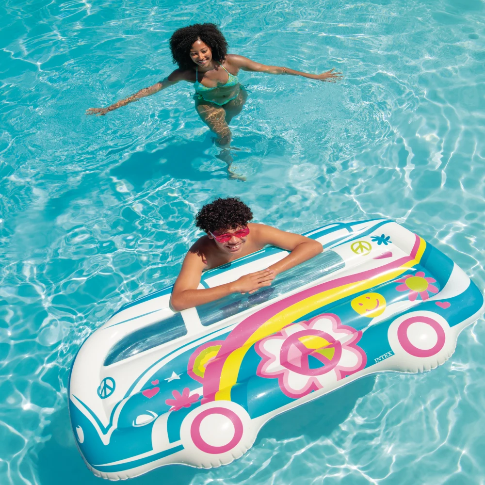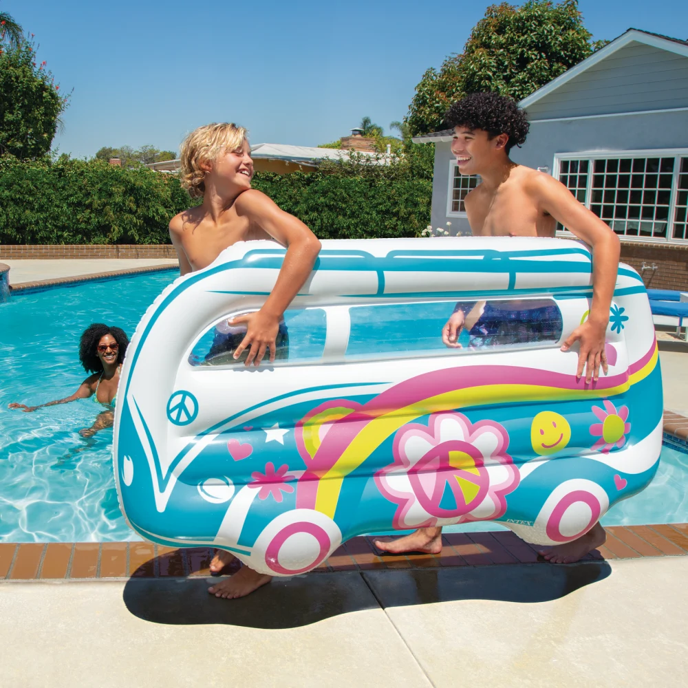 Plută gonflabilă cu design retro tip microbuz, ideală pentru relaxare și distracție la piscină sau la mare. Forma stabilă, culorile vesele și dimensiunea generoasă o fac ușor de folosit atât pentru joacă, cât și pentru plutire relaxată în apă.