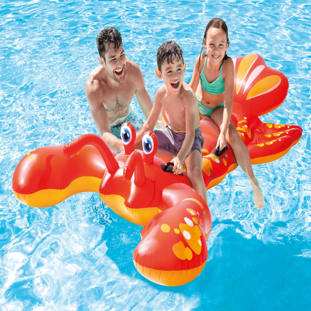 Plută gonflabilă în formă de homar, cu mânere de prindere, concepută pentru joacă și relaxare pe apă. Dimensiunile generoase oferă stabilitate și spațiu confortabil pentru utilizare în piscină sau la mare.