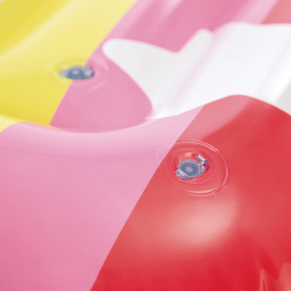 Pluta gonflabilă Curcubeu cu nori este concepută pentru momente de relaxare pe apă, combinând un design atractiv cu o structură stabilă. Forma alungită oferă o poziție comodă, iar marginile gonflabile asigură flotabilitate echilibrată în timpul utilizării.
