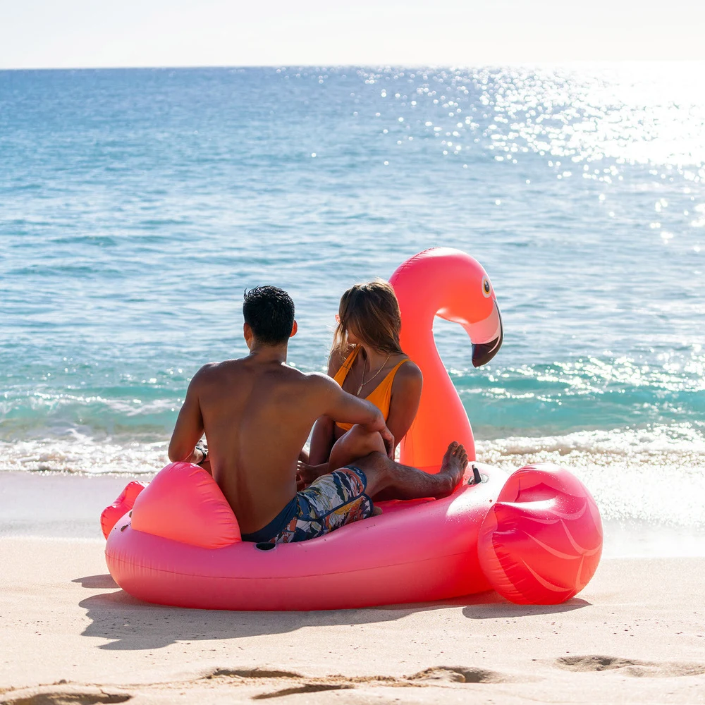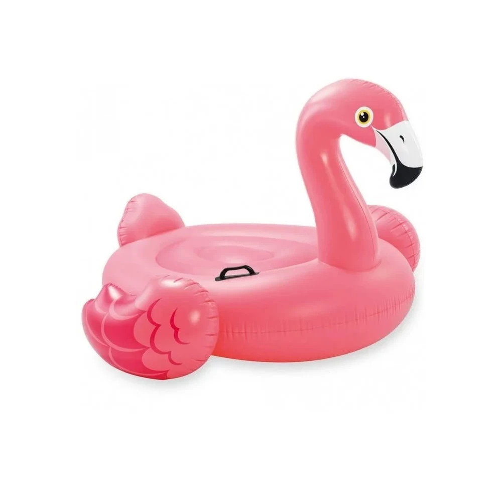Plută gonflabilă de mari dimensiuni, cu design Flamingo, dotată cu mânere pentru stabilitate și control mai bun pe apă. Ideală pentru relaxare și distracție la piscină, lac sau mare.
