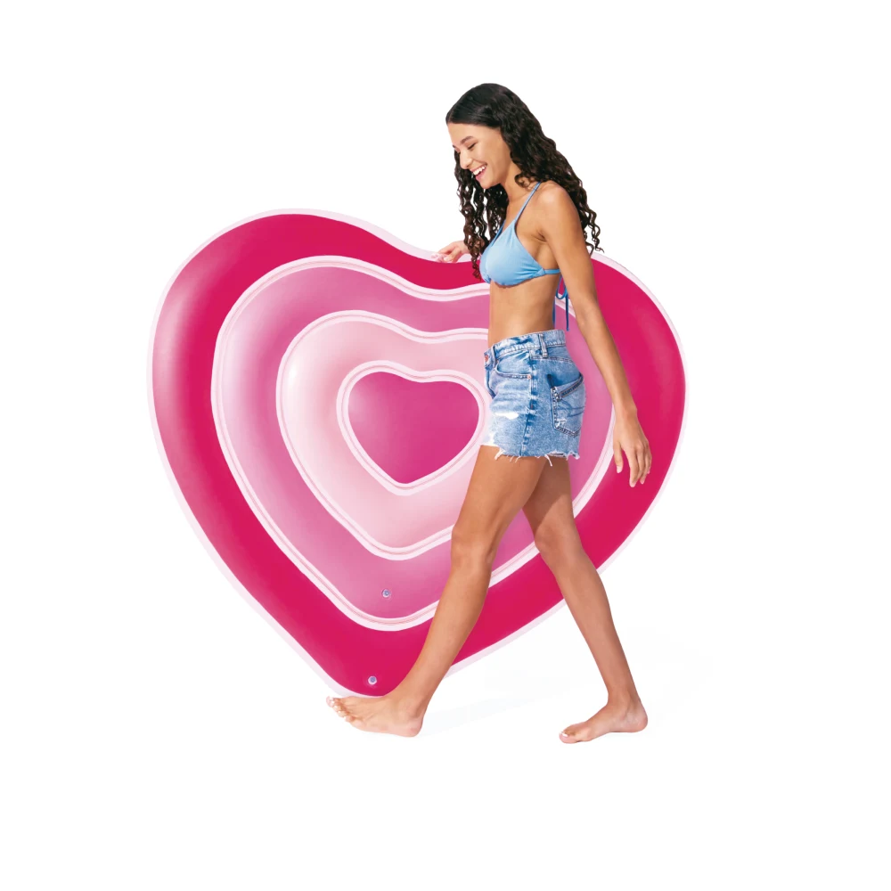 Plută gonflabilă în formă de inimă, cu design atrăgător și dimensiuni generoase, ideală pentru relaxare și distracție pe apă în zilele de vară.